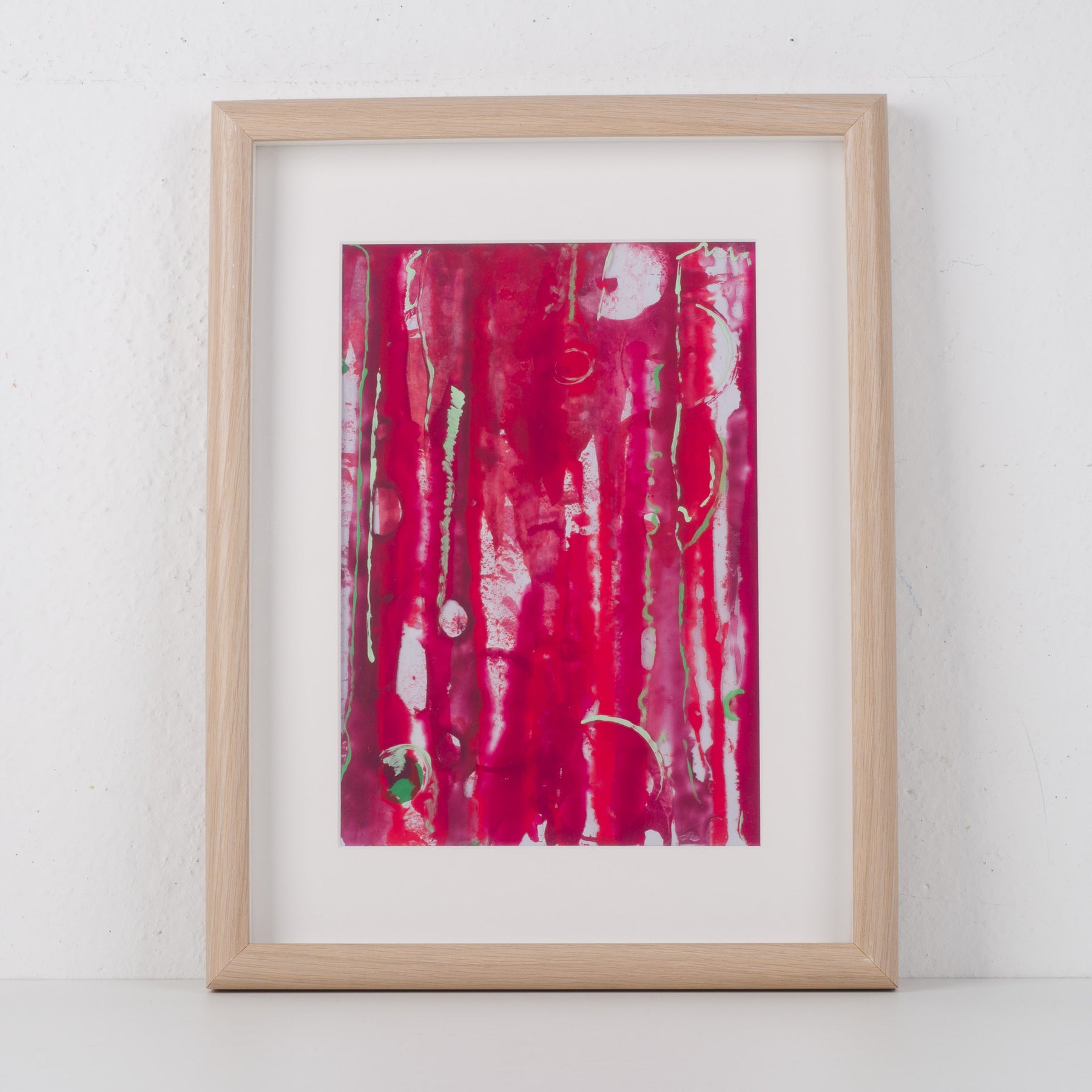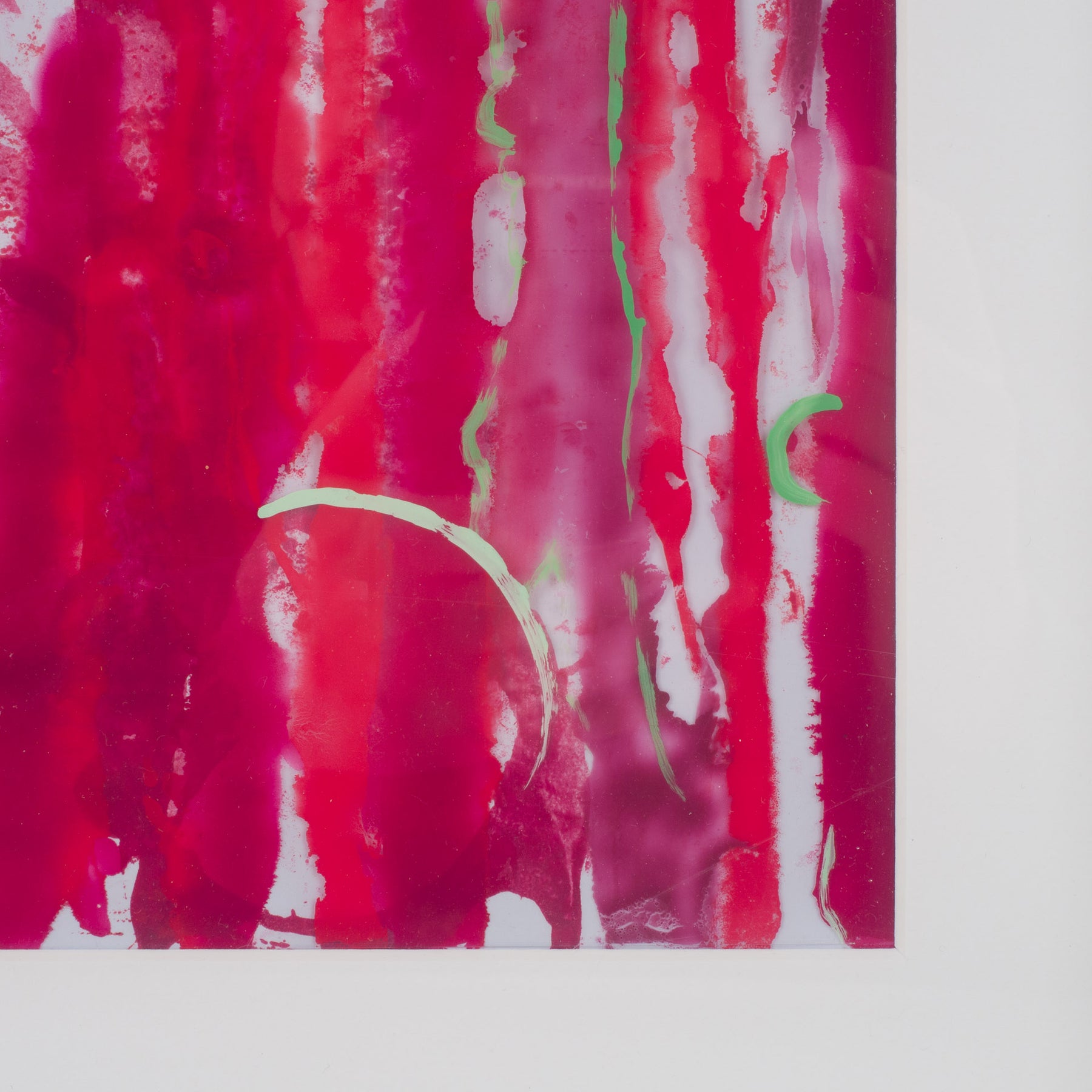 Een intrigerend hedendaags werk van Hilde Deceuninck, opgebouwd uit een veelvoud van transparante plastic laagjes van Mica, waarop in verschillende lagen werd geschilderd. De warme rode tinten worden subtiel doorbroken door een groen accent, wat het werk diepte en beweging geeft.