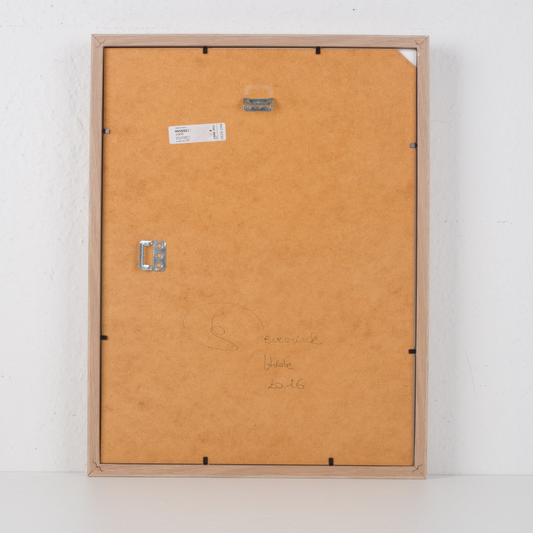 Het werk (inclusief kader) meet 42,5 x 33,5 x 3 cm en is gepresenteerd in een houten kader, achter plexiglas. In een goede staat, met hier en daar lichte gebruikssporen op het plexi en het kader — sporen die getuigen van zijn leven en authenticiteit.