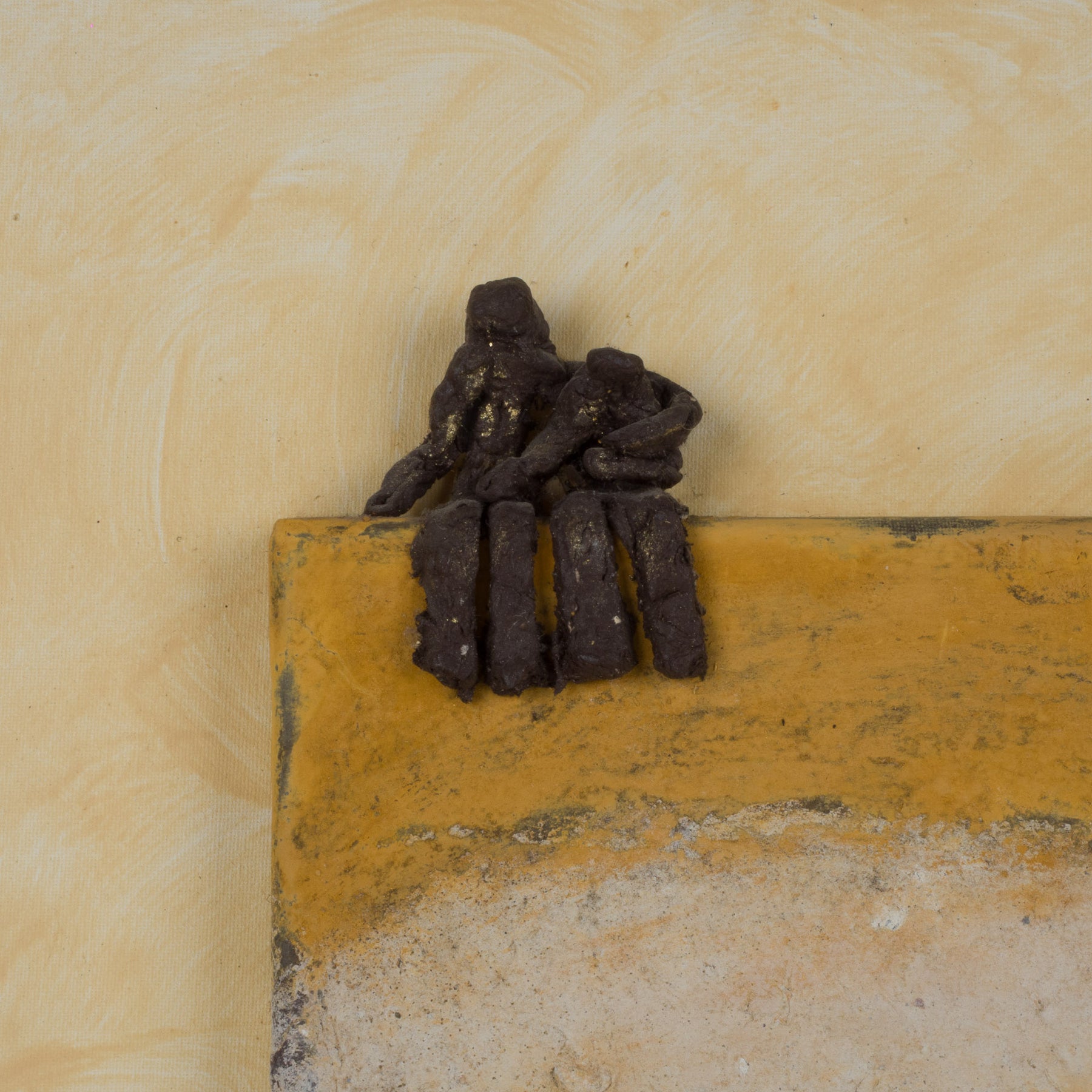 Schilderij in okergeel met 3D beeldje van zittende figuren – 40x40 cm