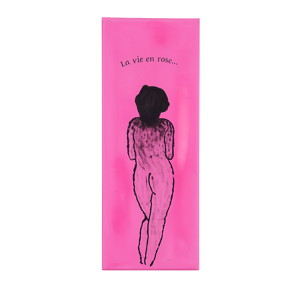 Een krachtig zwart silhouet van een vrouw, geschilderd op een levendige roze achtergrond. De compositie is smal en verticaal (20 x 50 cm), wat het werk een elegante, bijna sculpturale aanwezigheid geeft. Het contrast tussen het diepe zwart en het gelaagde roze creëert spanning én zachtheid tegelijk.