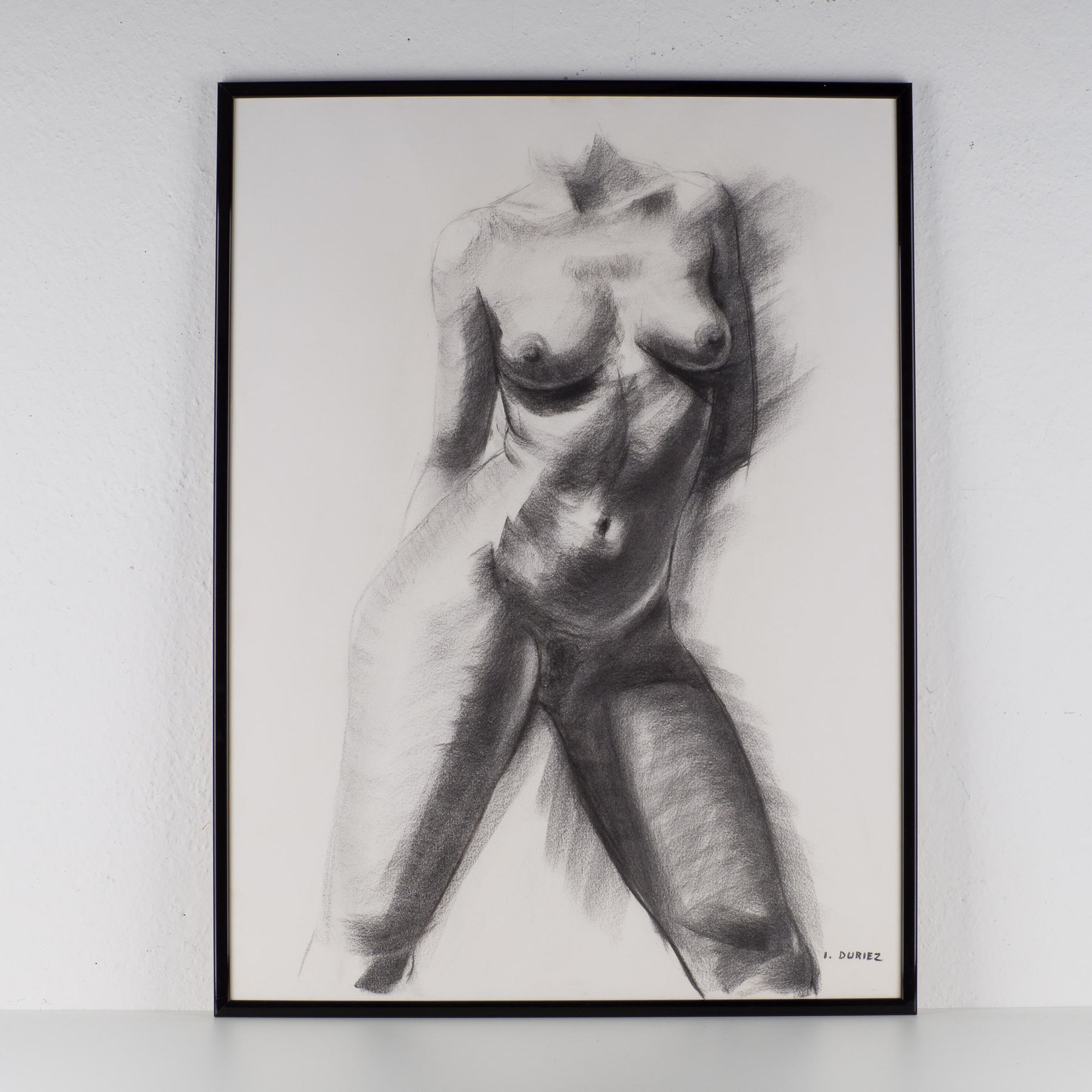 Een prachtige tekening van de gerenommeerde West-Vlaamse kunstenaar Irénée Duriez, bekend om zijn gevoelige en verfijnde weergave van de vrouwelijke vorm. Deze elegante voorstelling toont een naaktvrouw, uitgevoerd in zwarttinten, waarin Duriez’ kenmerkende balans tussen kracht en zachtheid duidelijk naar voren komt.