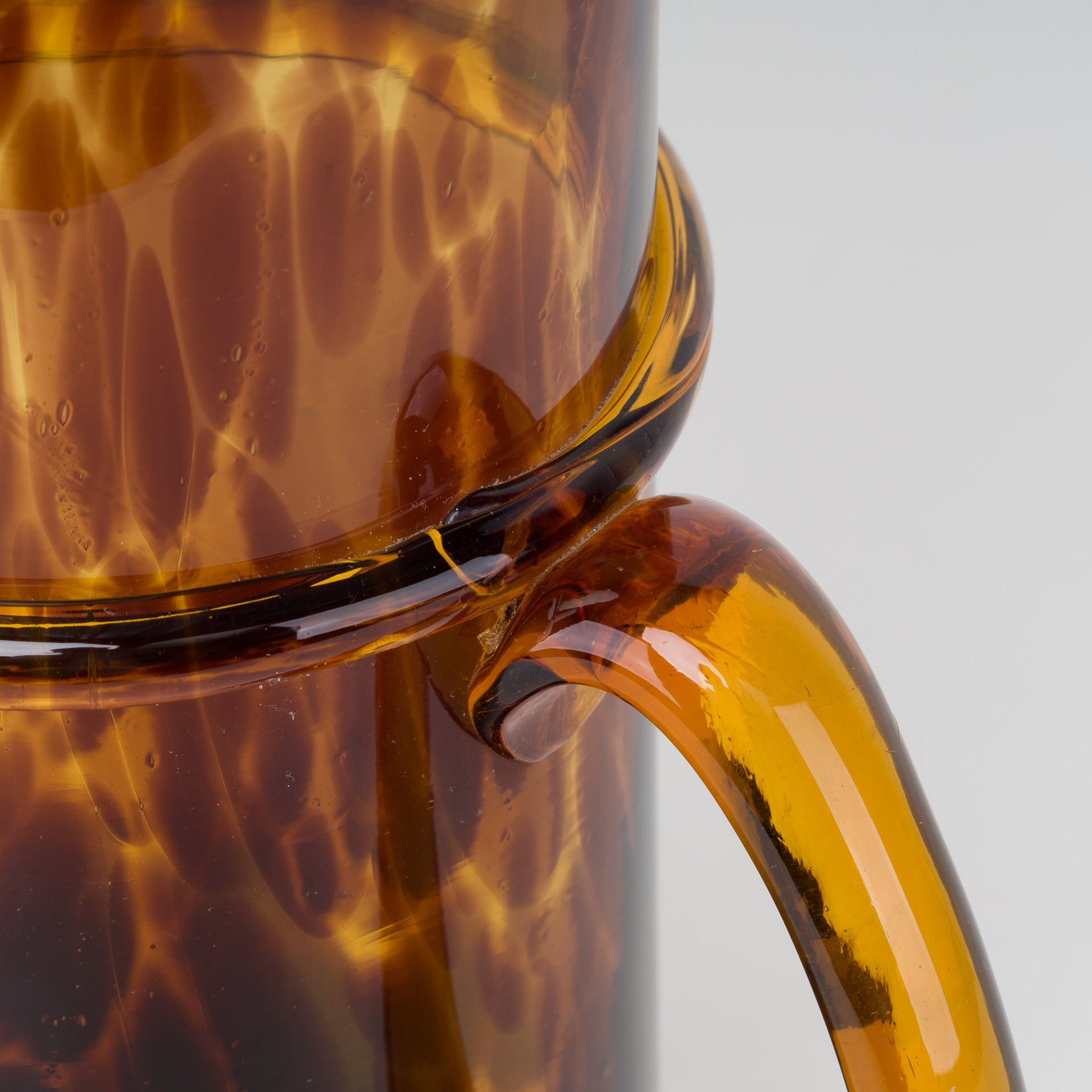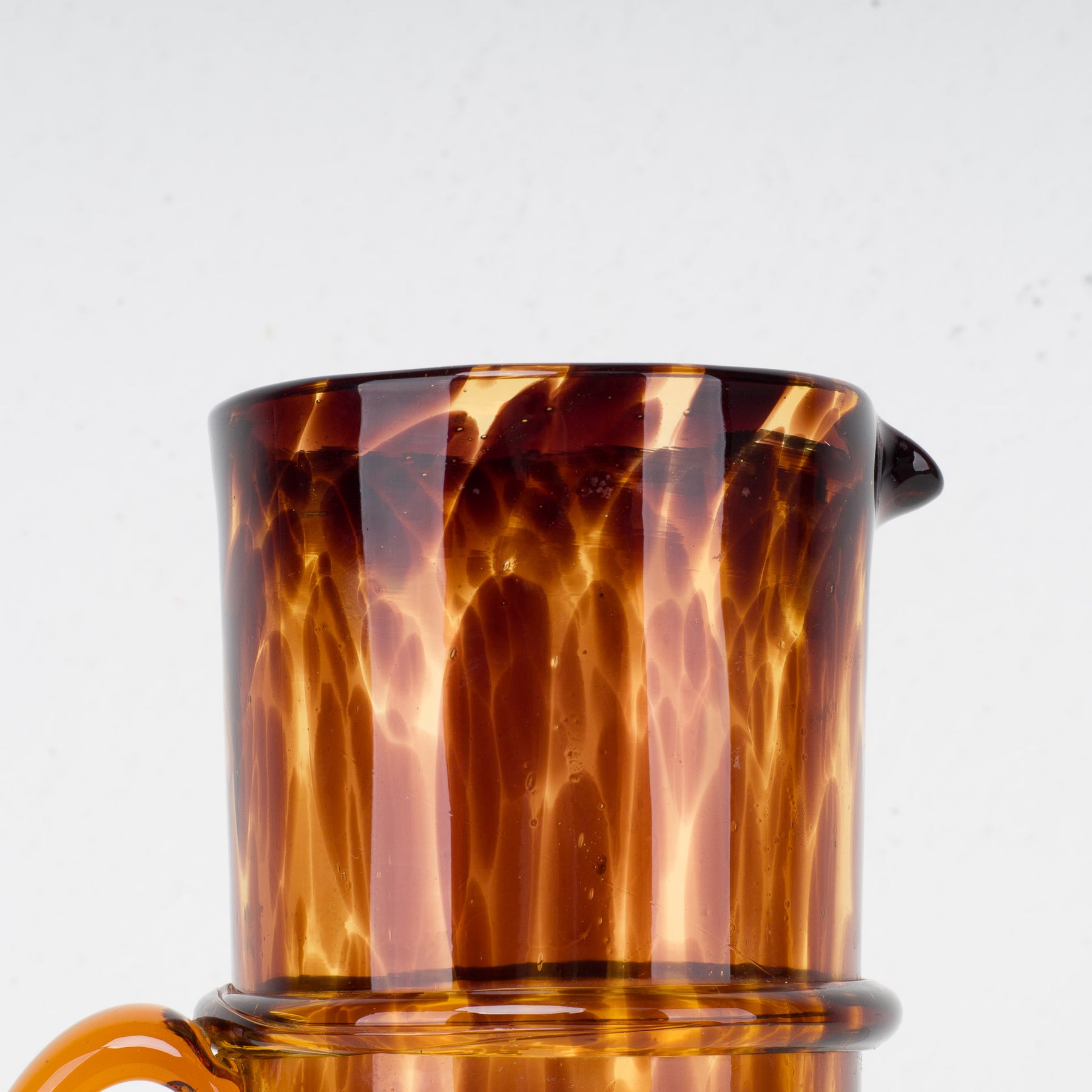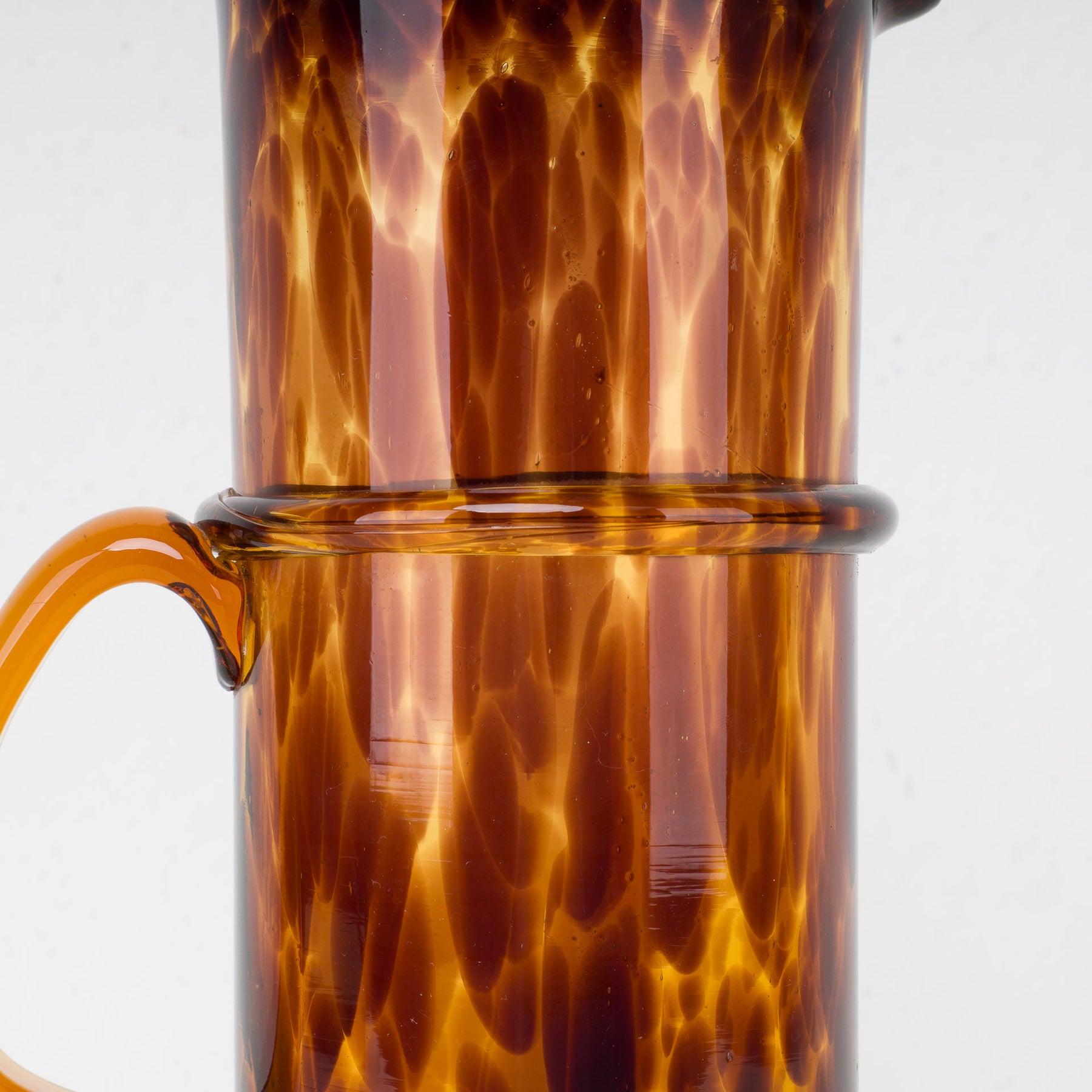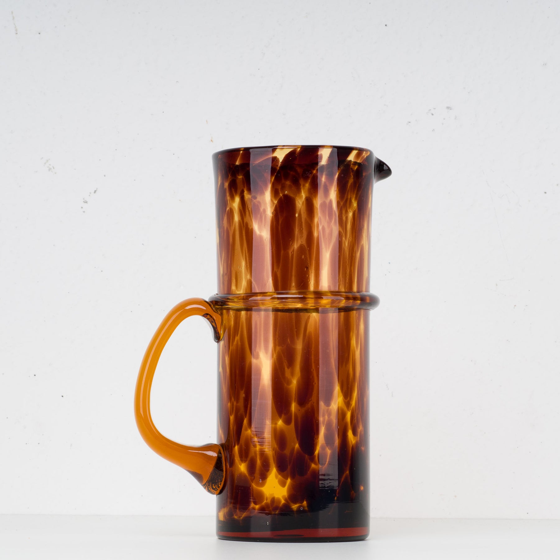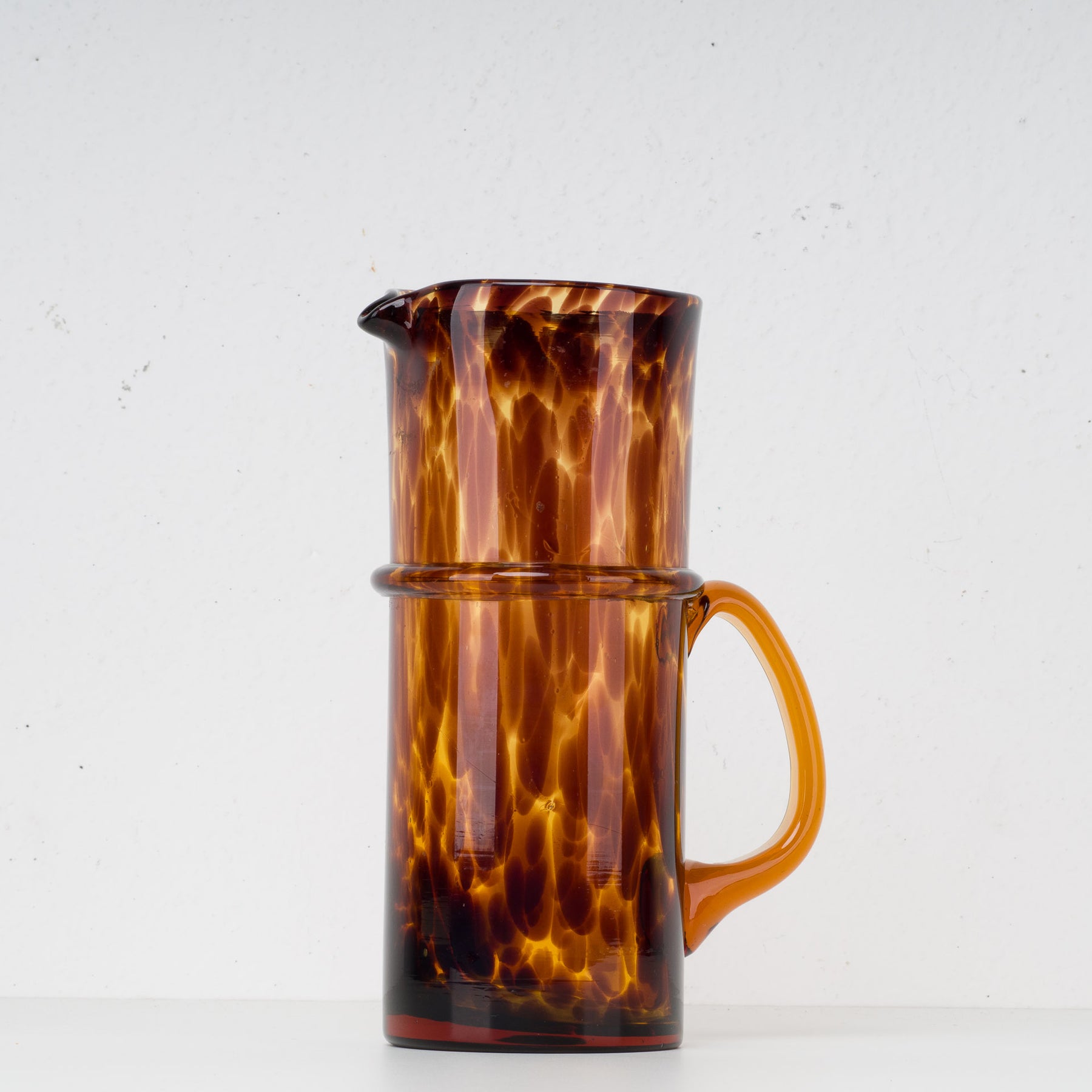 Een stijlvolle en karaktervolle glazen schenkkan in een warm bruin schildpadmotief. De subtiele schakeringen in het glas geven dit stuk een elegante, bijna vintage uitstraling die perfect past in zowel een klassiek als een eigentijds interieur.