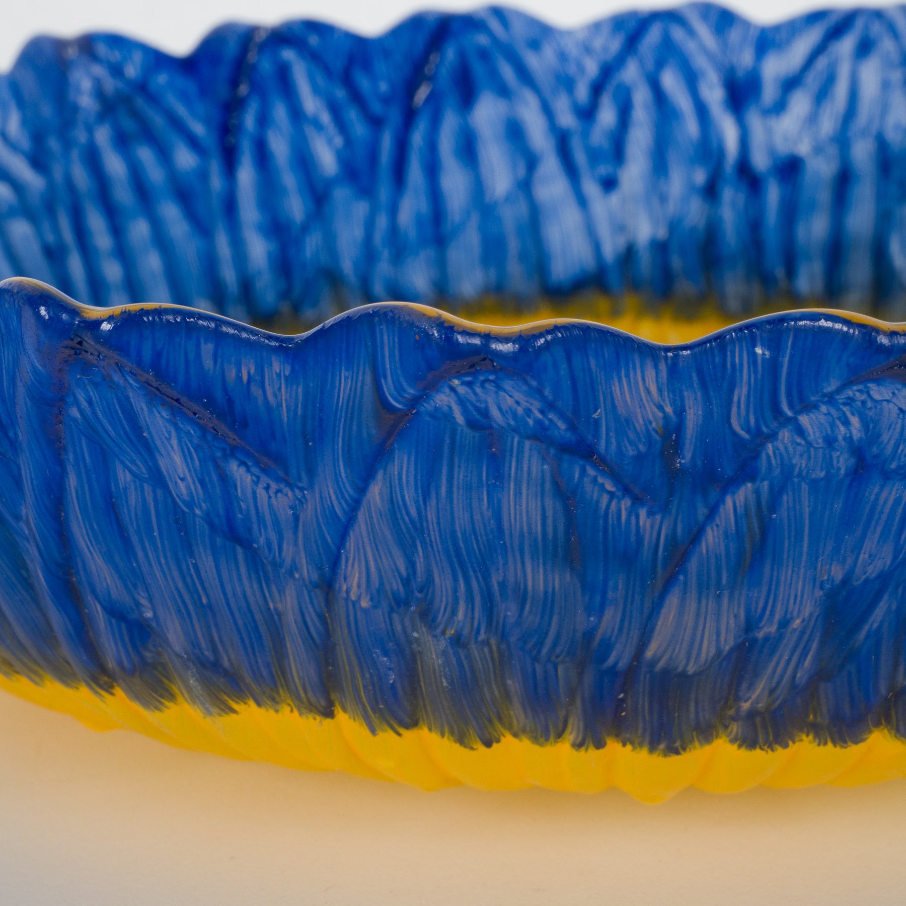 Een prachtige handbeschilderde glazen schaal in levendige tinten geel en blauw. De speelse, gekartelde rand geeft dit unieke stuk een expressieve uitstraling. Met een afmeting van 26,5 x 26,5 x 6,5 cm is het een echte blikvanger op tafel, in een kast of als artistiek accent in het interieur.