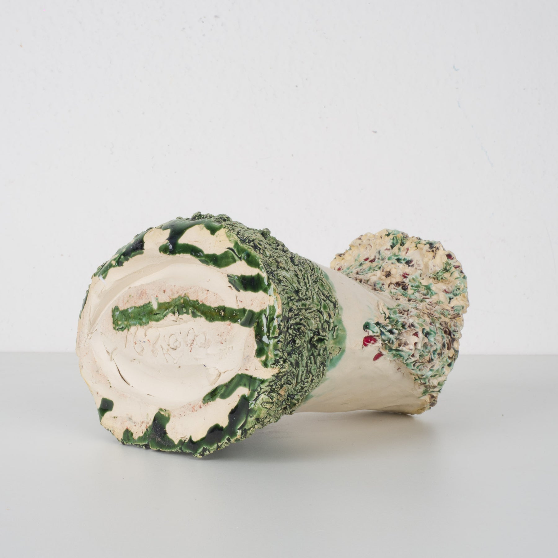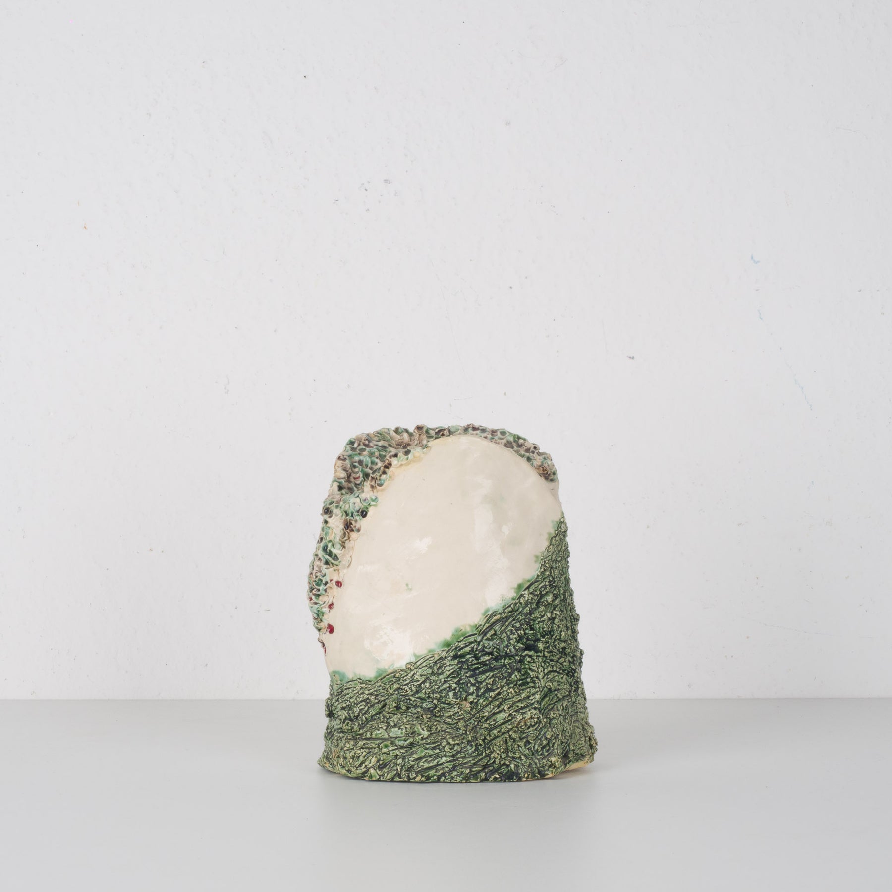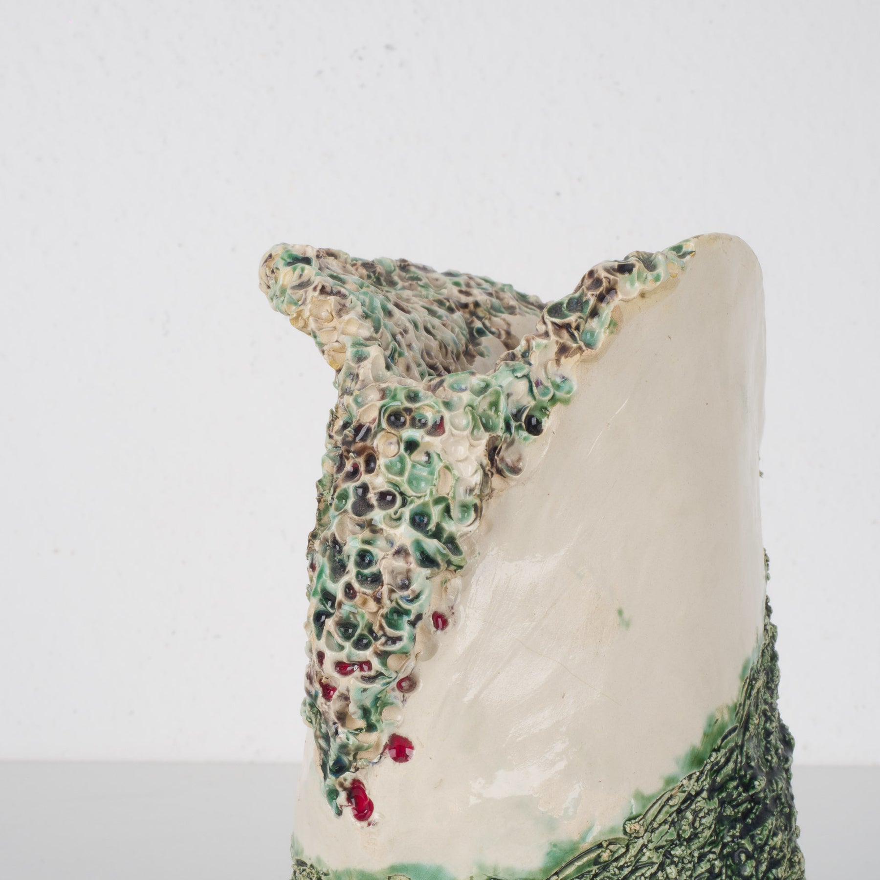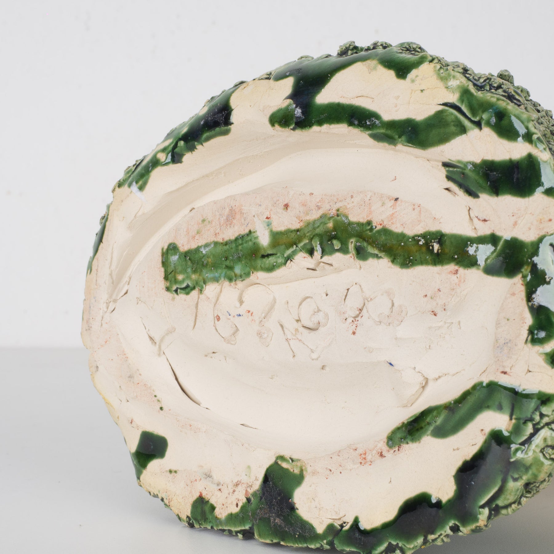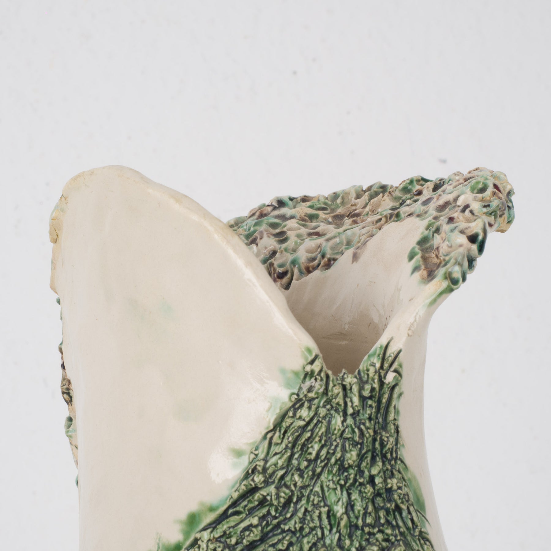 Deze bijzondere vaas is gevormd als een bloemkoolblad – organisch, zacht golvend en verrassend gedetailleerd. De kleurschakeringen in groen en beige versterken het natuurlijke karakter van het stuk, terwijl de glazuurlaag subtiel licht vangt. Gesigneerd door de maker, wat het een extra toets van authenticiteit geeft.