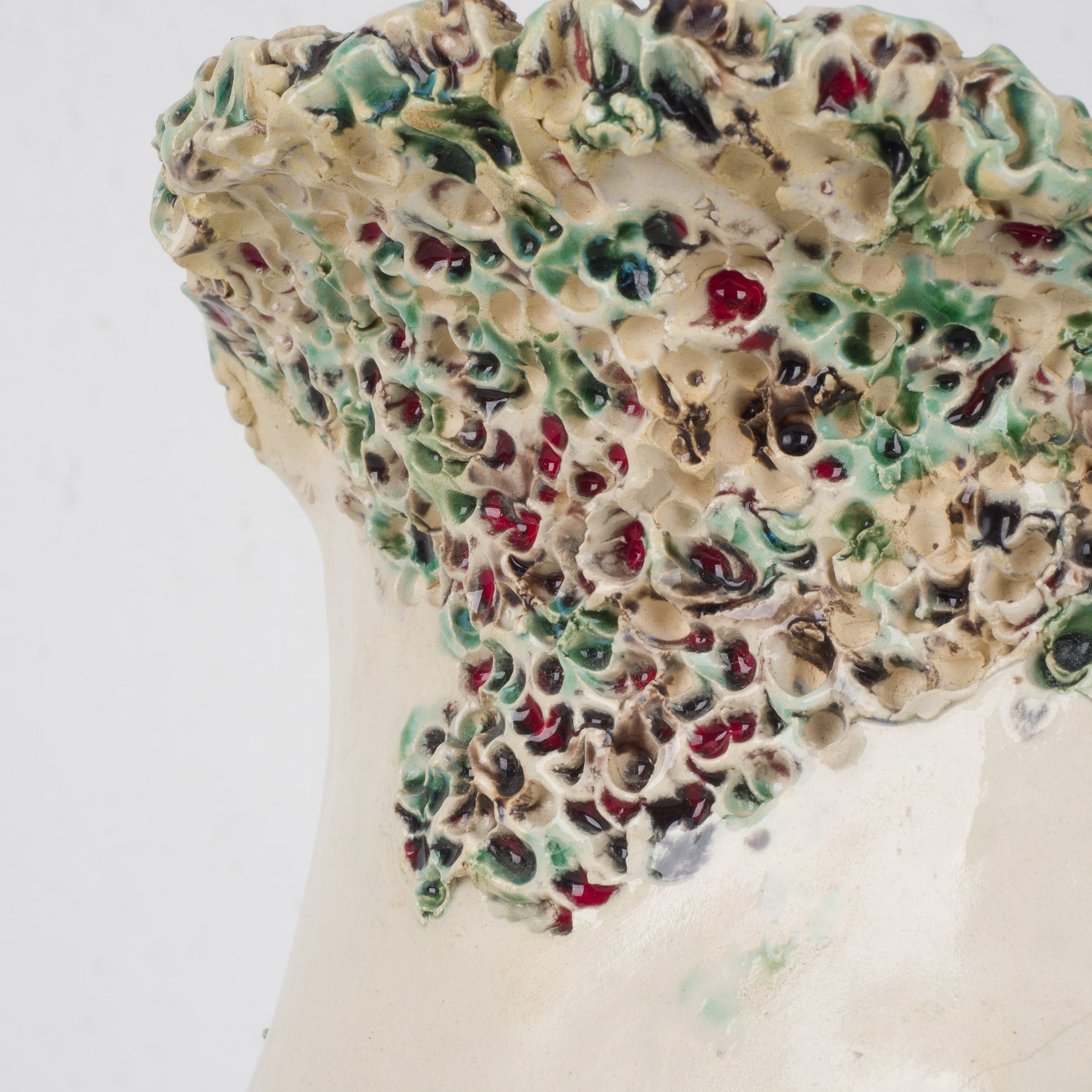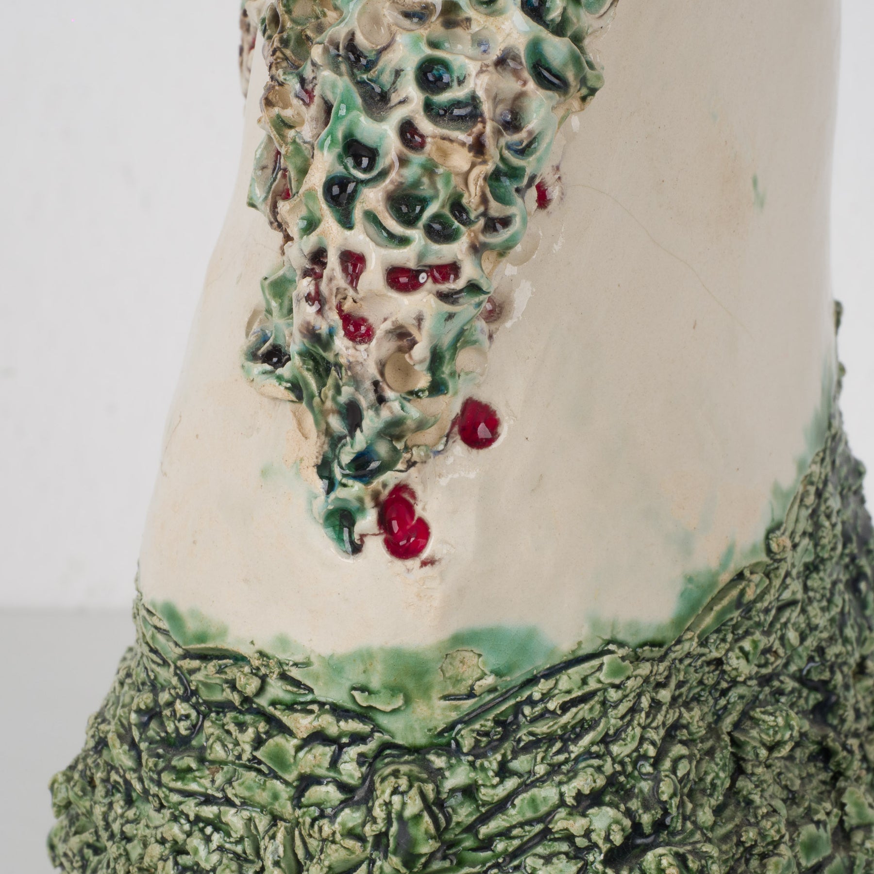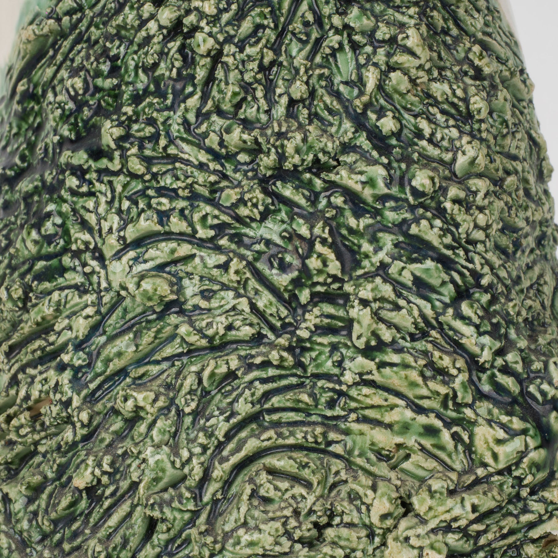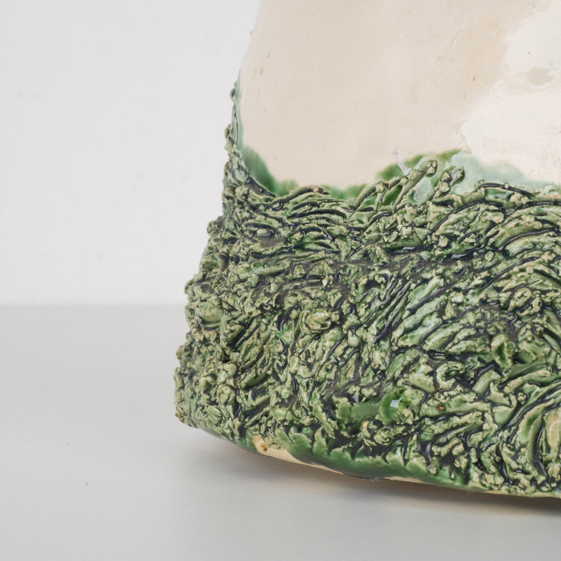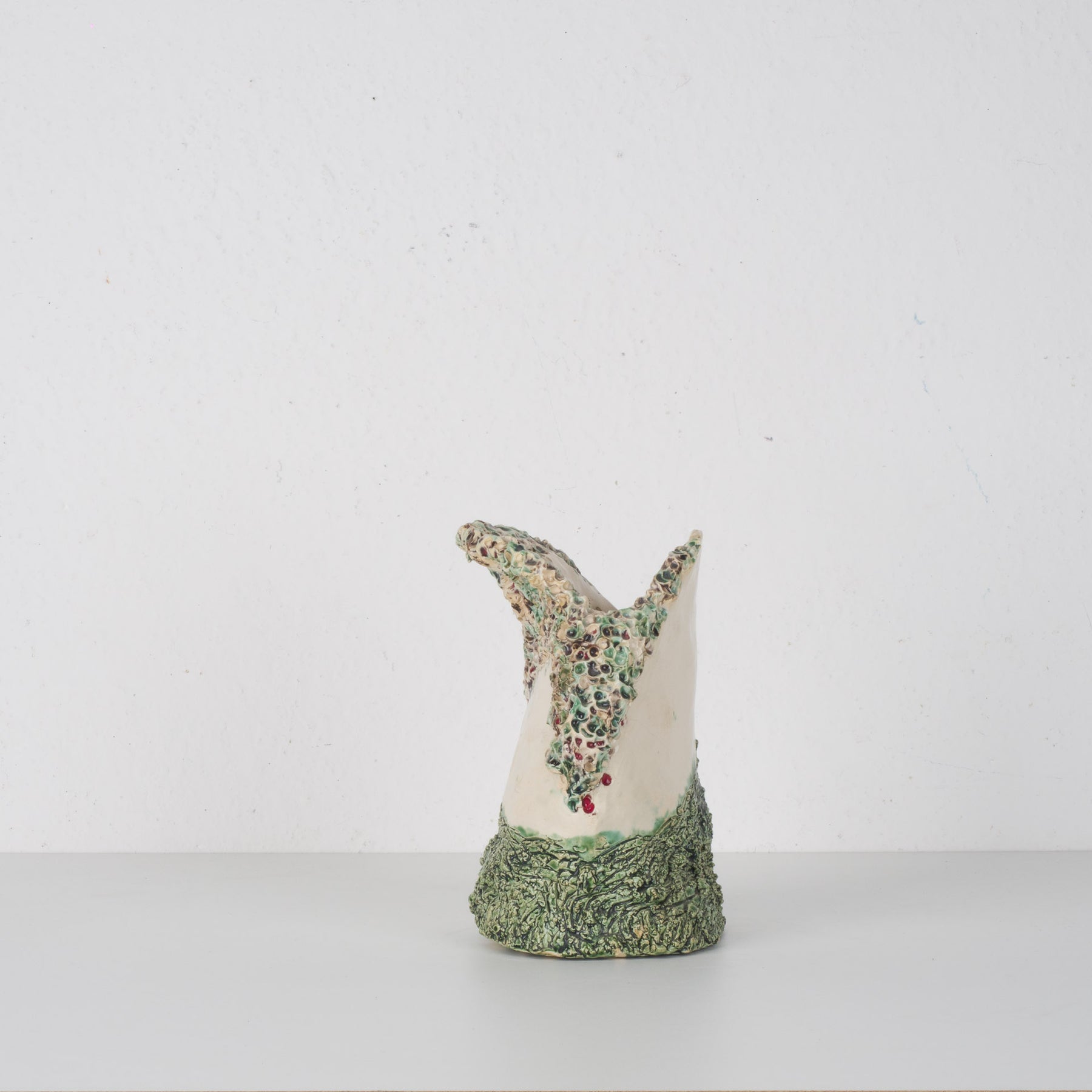Deze bijzondere vaas is gevormd als een bloemkoolblad – organisch, zacht golvend en verrassend gedetailleerd. De kleurschakeringen in groen en beige versterken het natuurlijke karakter van het stuk, terwijl de glazuurlaag subtiel licht vangt. Gesigneerd door de maker, wat het een extra toets van authenticiteit geeft.