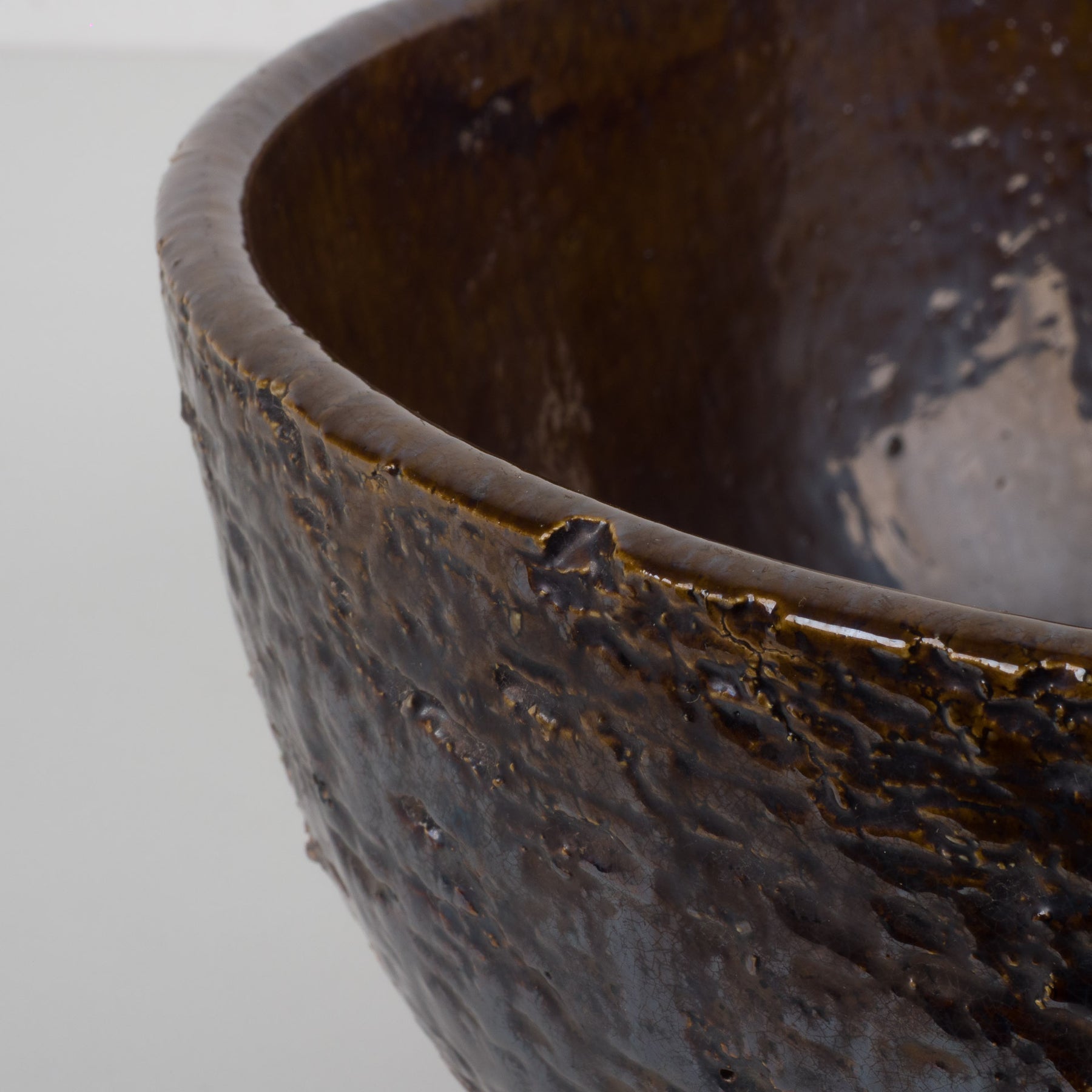 De diepe bruintinten, subtiele schakeringen en het levendige craquelé-effect geven de schaal een warme, aardse uitstraling. De textuur is rijk en tactiel, met een ruw en organisch oppervlak dat het ambachtelijke karakter benadrukt. Binnenin contrasteert de donkere glans mooi met de meer robuuste buitenzijde — een spel tussen verfijning en puurheid.