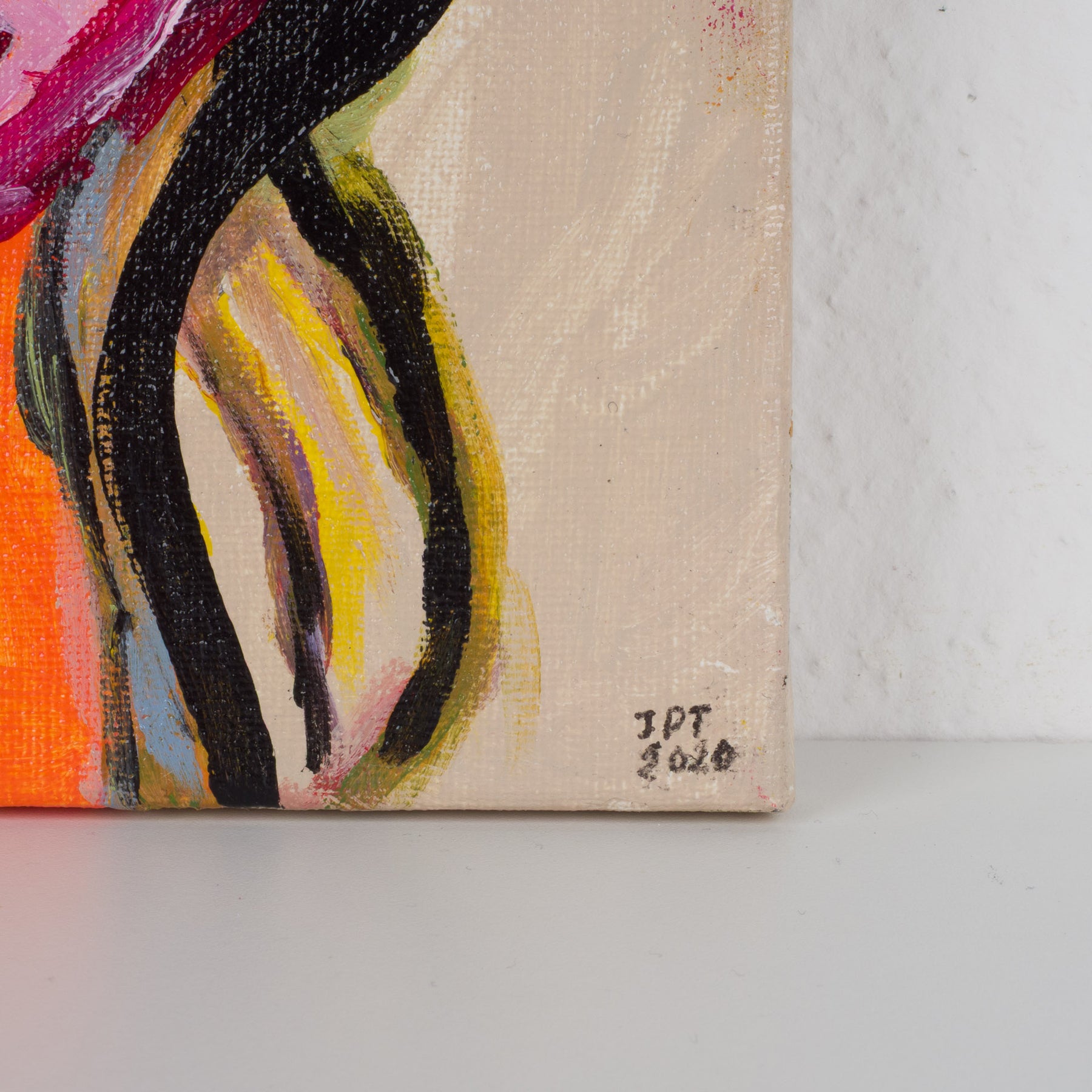 Dit hedendaagse schilderij van JP Terryn (20,5 x 20,5 x 1,5 cm) is een compact maar opvallend werk dat onmiddellijk de aandacht trekt. In een krachtig kleurenpalet van fuchsia, paars, oranje, oker en zachte blauwtinten verschijnt een expressief vrouwelijk portret, omlijnd door energieke zwarte contouren.