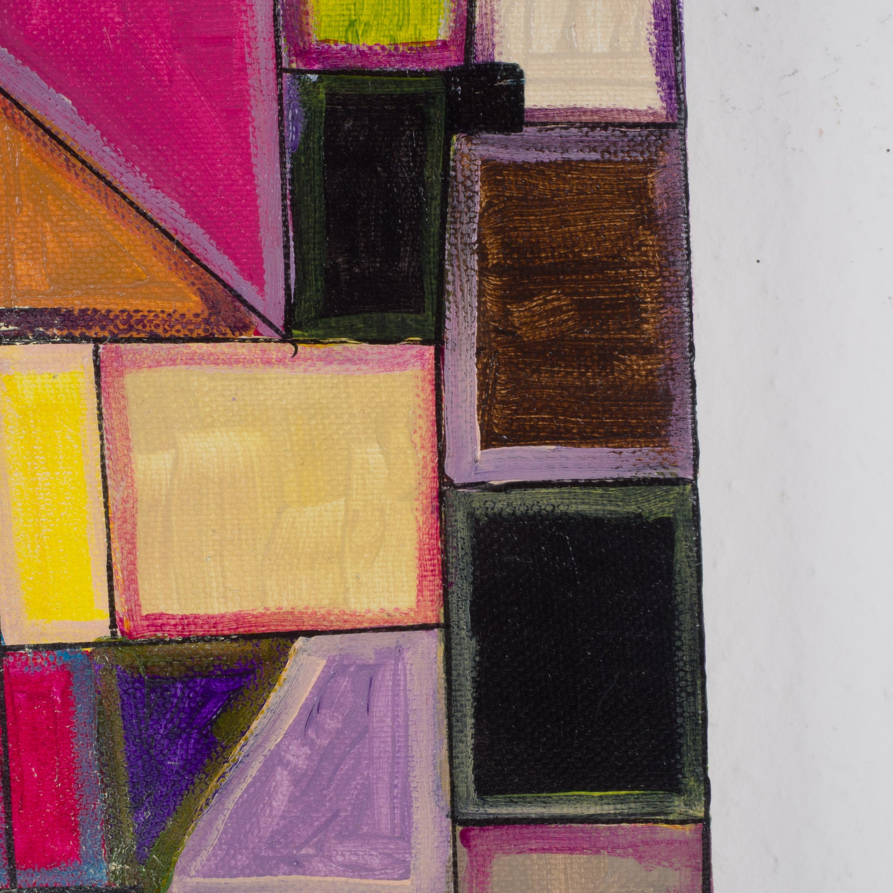 De zichtbare penseelstreken en gelaagde verfopbouw geven het werk een tastbaar, handgemaakt karakter. Elk kleurvlak heeft zijn eigen textuur en intensiteit, waardoor het schilderij blijft boeien, ook van dichtbij bekeken. De abstracte vormentaal laat ruimte voor interpretatie en maakt het werk toegankelijk zonder eenduidig te worden.