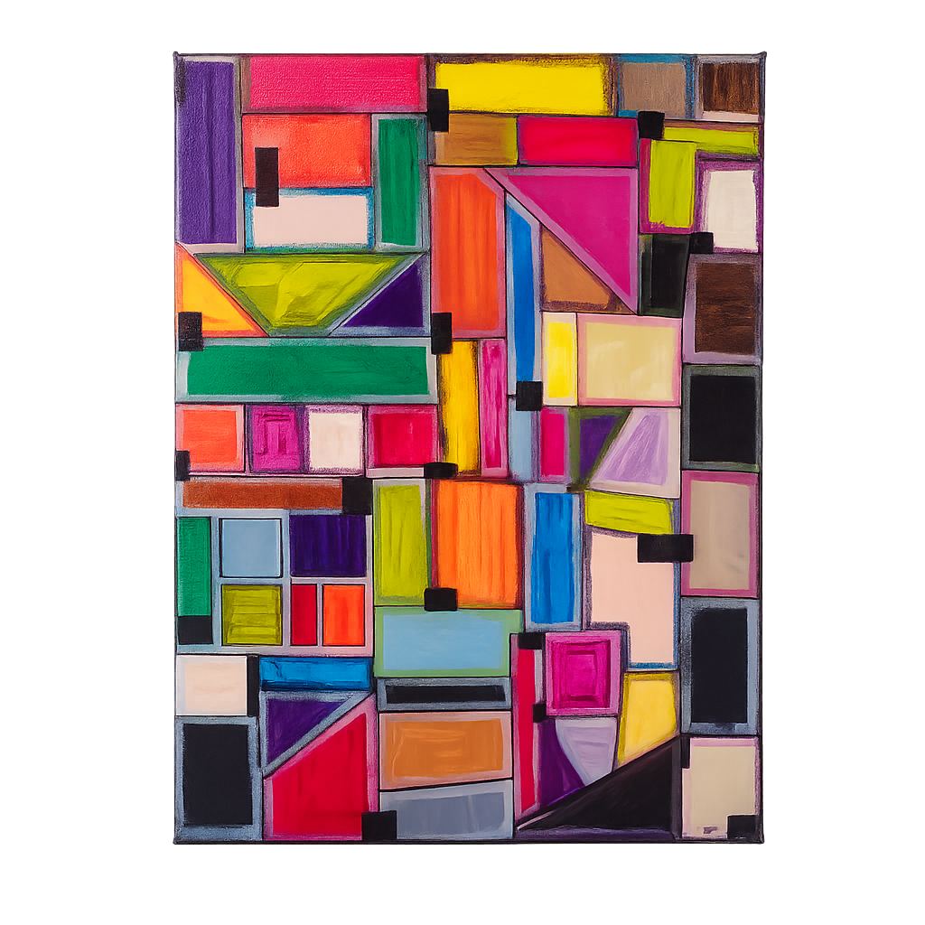 Dit hedendaags kleurrijk schilderij van JP Terryn is een krachtig en speels opgebouwd werk, waarin geometrie en kleur elkaar in evenwicht houden. Het schilderij bestaat uit een ritmisch geheel van kleurvlakken, lijnen en subtiele zwarte accenten die de compositie structureren en verbinden. Heldere tinten zoals geel, roze, groen, blauw en paars worden afgewisseld met donkere partijen, wat zorgt voor spanning en diepte.