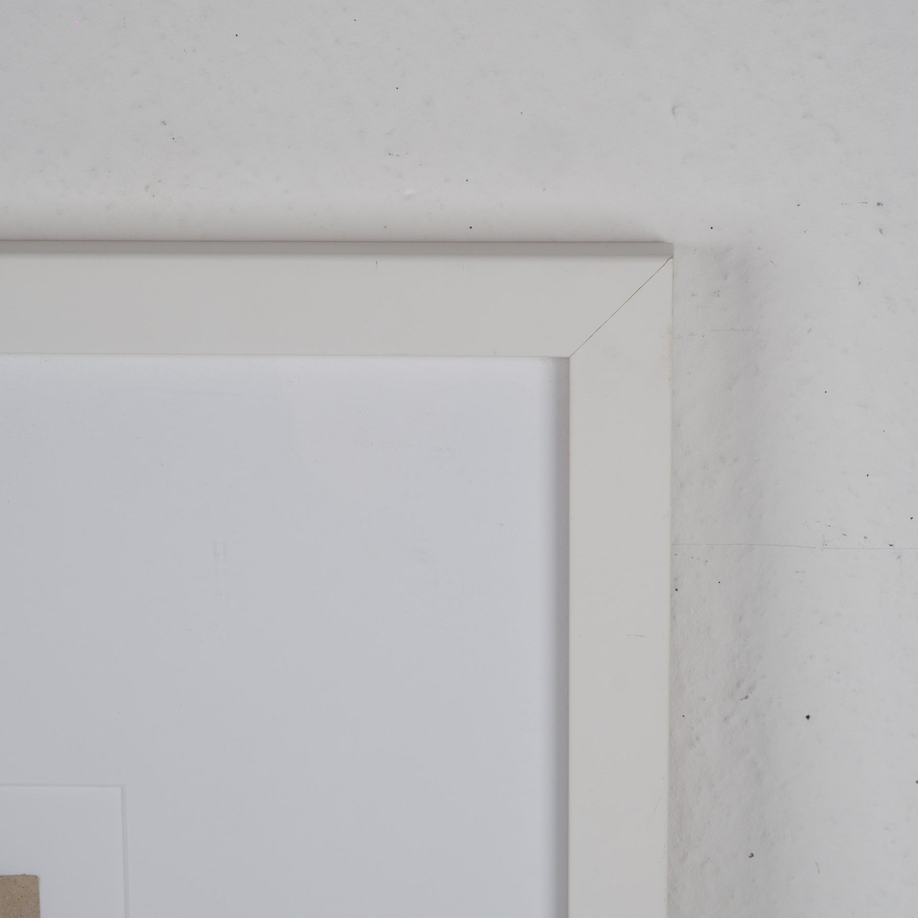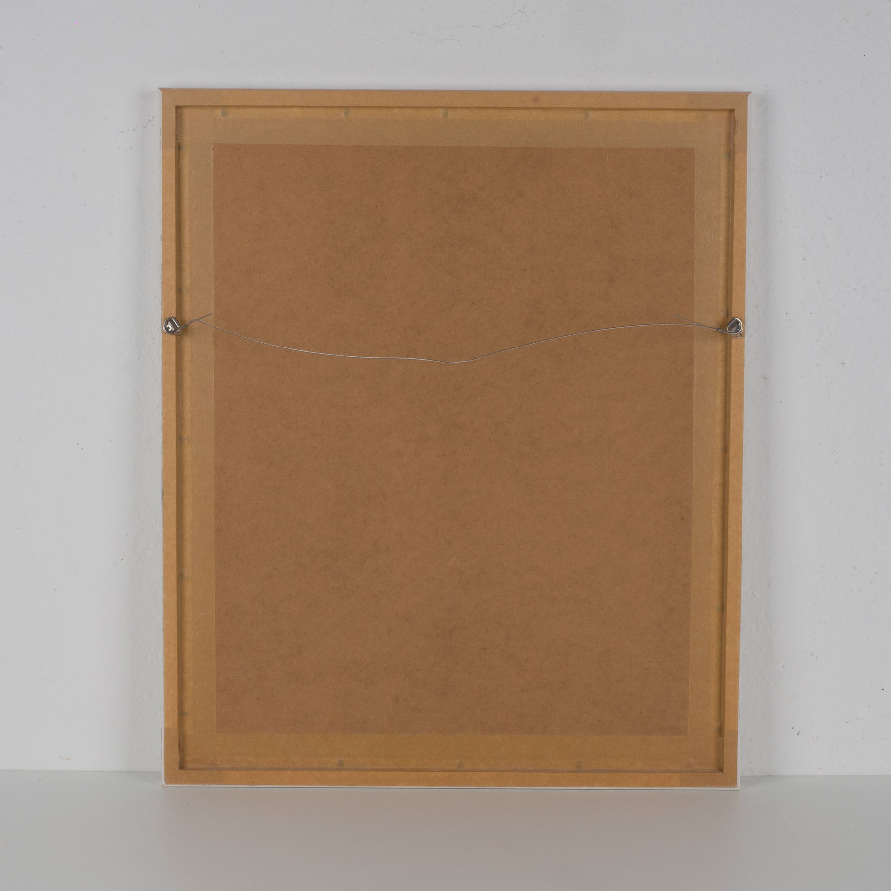 Het werk is geschilderd op papier en subtiel ingekaderd in een strak wit kader, achter glas. Het contrast tussen de vrije, intuïtieve schilderstijl en de sobere omlijsting zorgt voor een mooie balans.