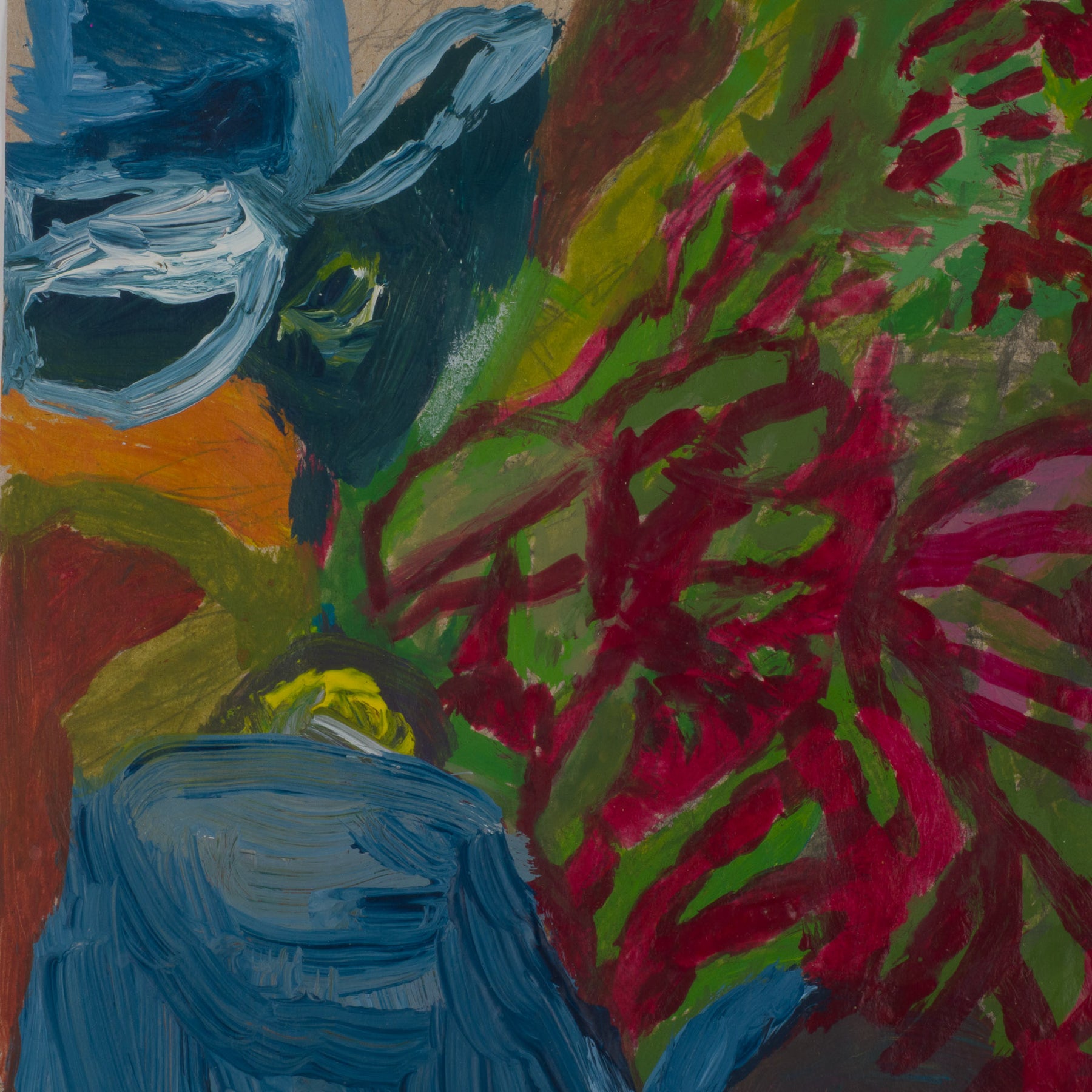 Dit expressieve en kleurrijke schilderij van Bo Staers brengt een krachtig boeket tot leven in volle bloei. Met spontane penseelstreken en een intens kleurenpalet van dieprood, frisgroen en levendig blauw creëert de kunstenares een dynamisch en bijna tastbaar bloemstuk. De bloemen lijken te bewegen over het papier, alsof ze net geplukt zijn en nog vol energie zitten.
