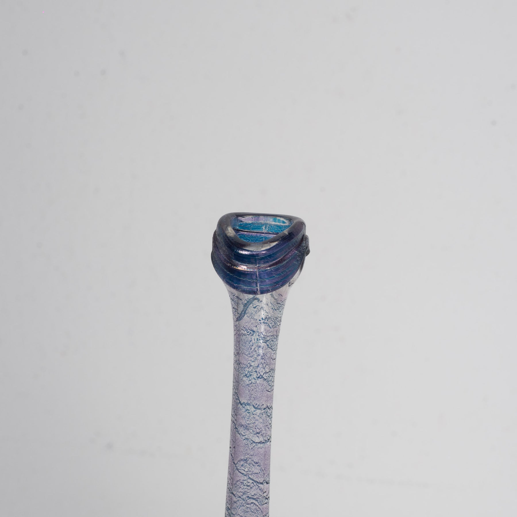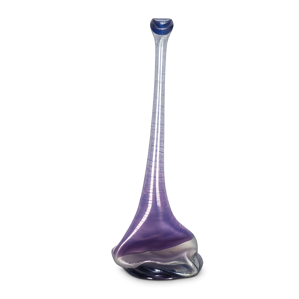 The subtle color transitions in shades of purple, lilac, and blue flow harmoniously into one another and are enhanced by fine horizontal lines in the glass. The iridescent, almost pearlescent underside gives the object added depth and a luxurious appearance. The interplay of light and transparency changes the vase's character depending on the light – a typical characteristic of high-quality studio glass.