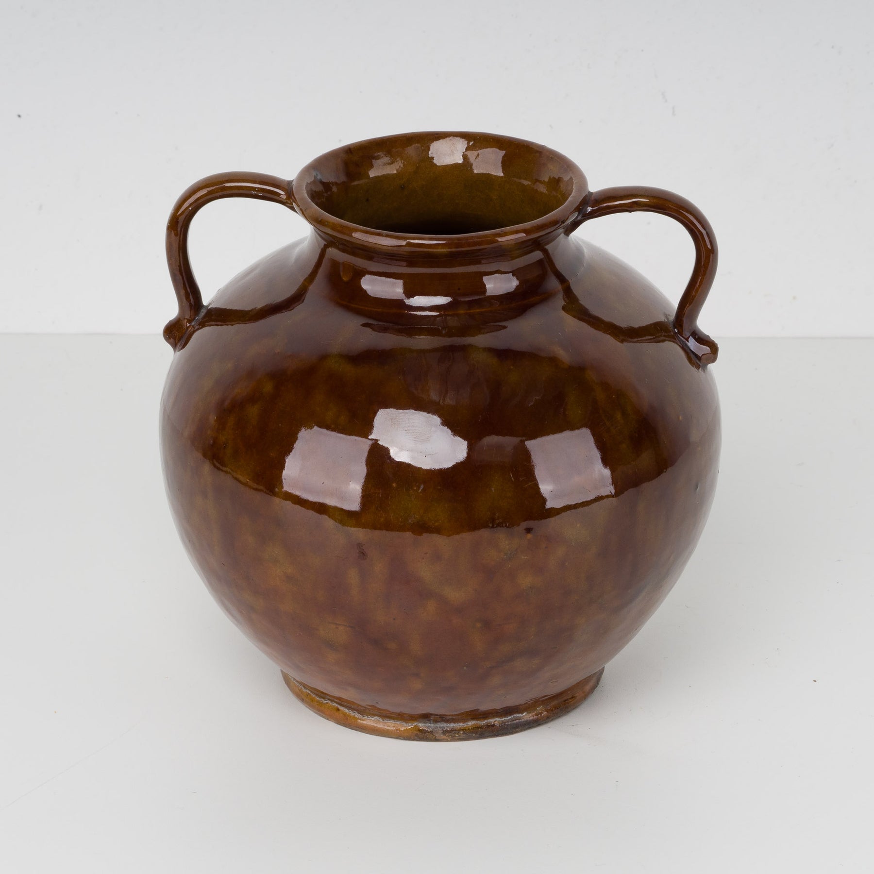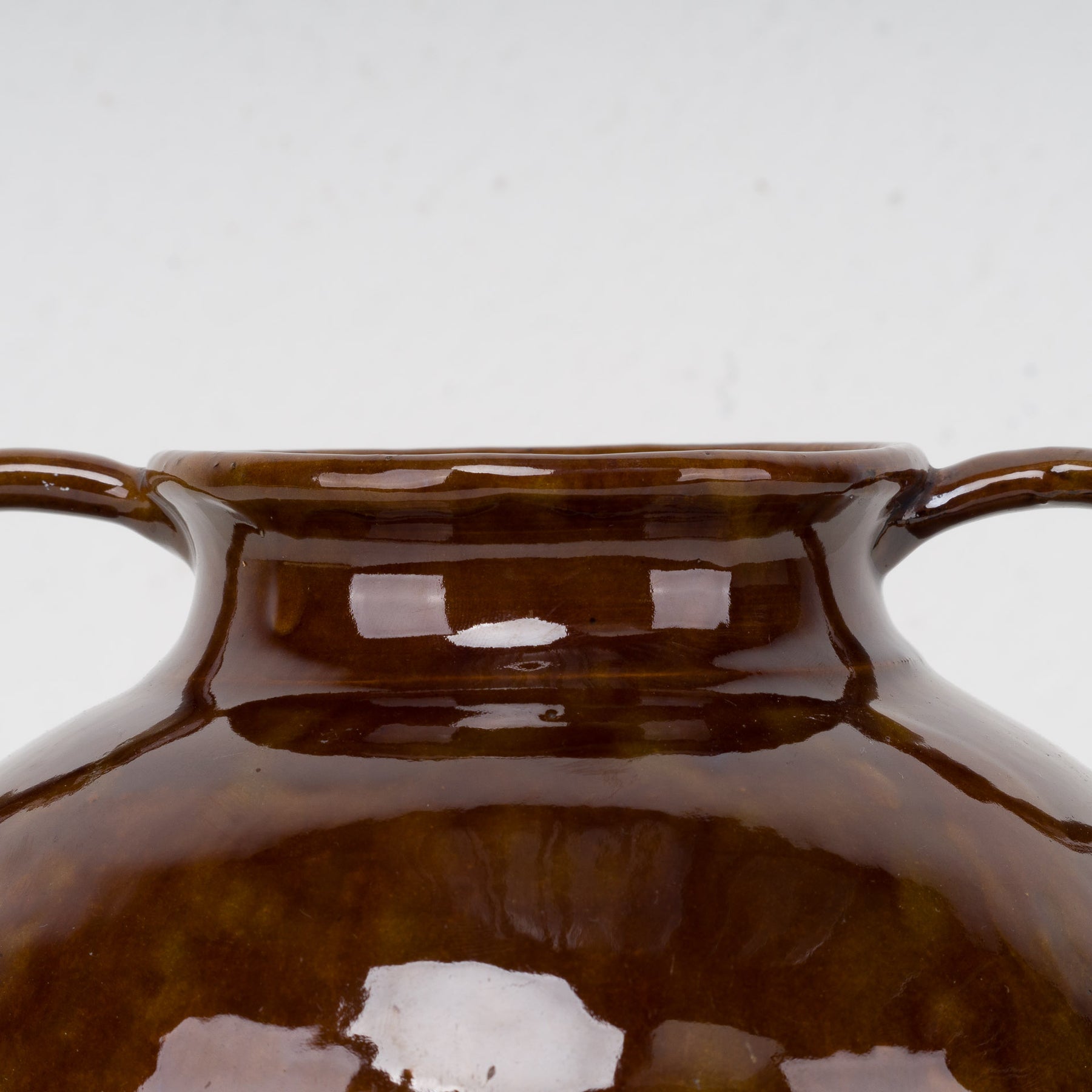 The vase is finished with a rich brown glaze that subtly varies in tone. The deep chestnut brown shades create a vibrant surface, while the glossy finish beautifully reflects light. The glaze exhibits natural nuances and color shifts, giving each piece a unique character. A slight color transition is visible at the bottom, typical of artisan-fired ceramics – a detail that emphasizes its authenticity.