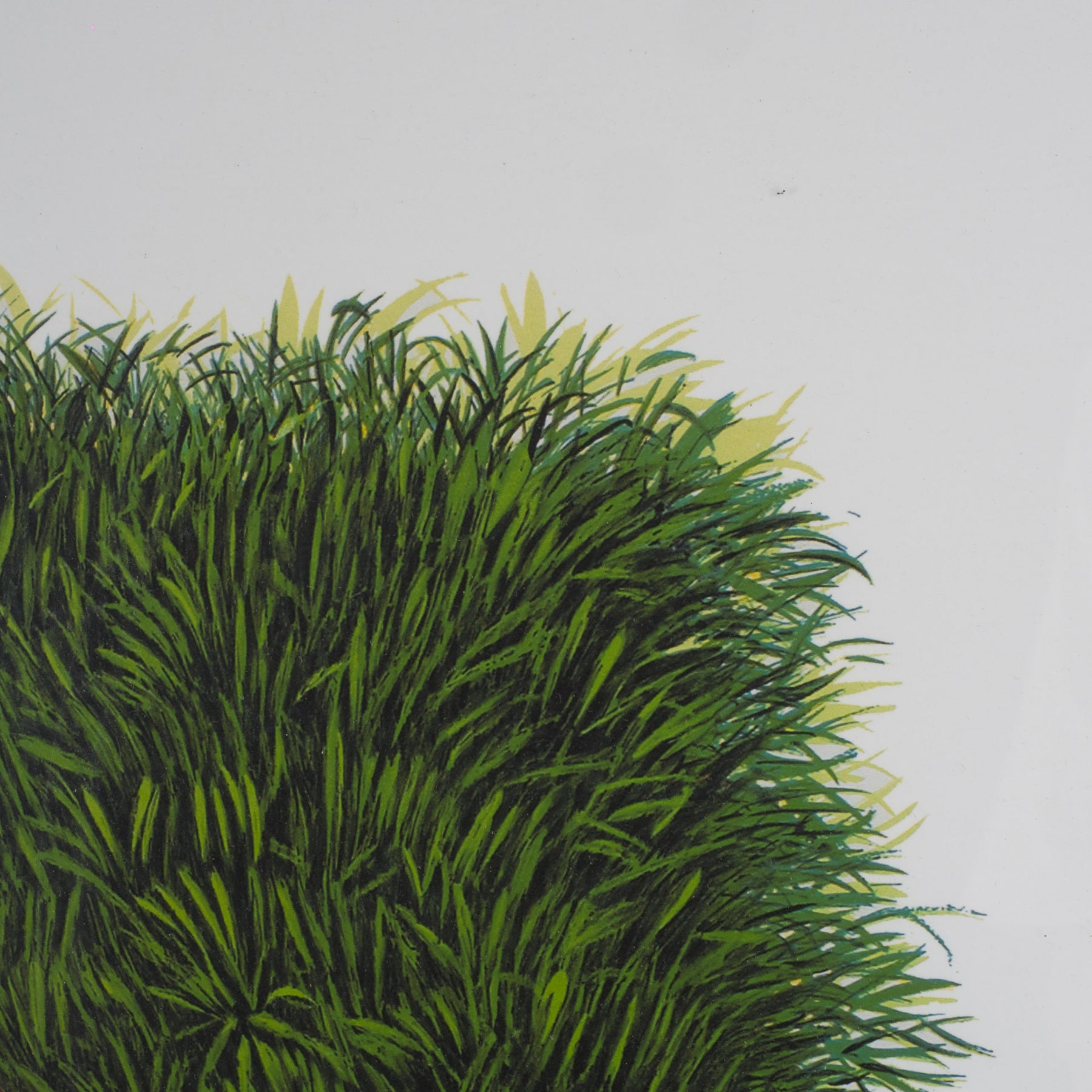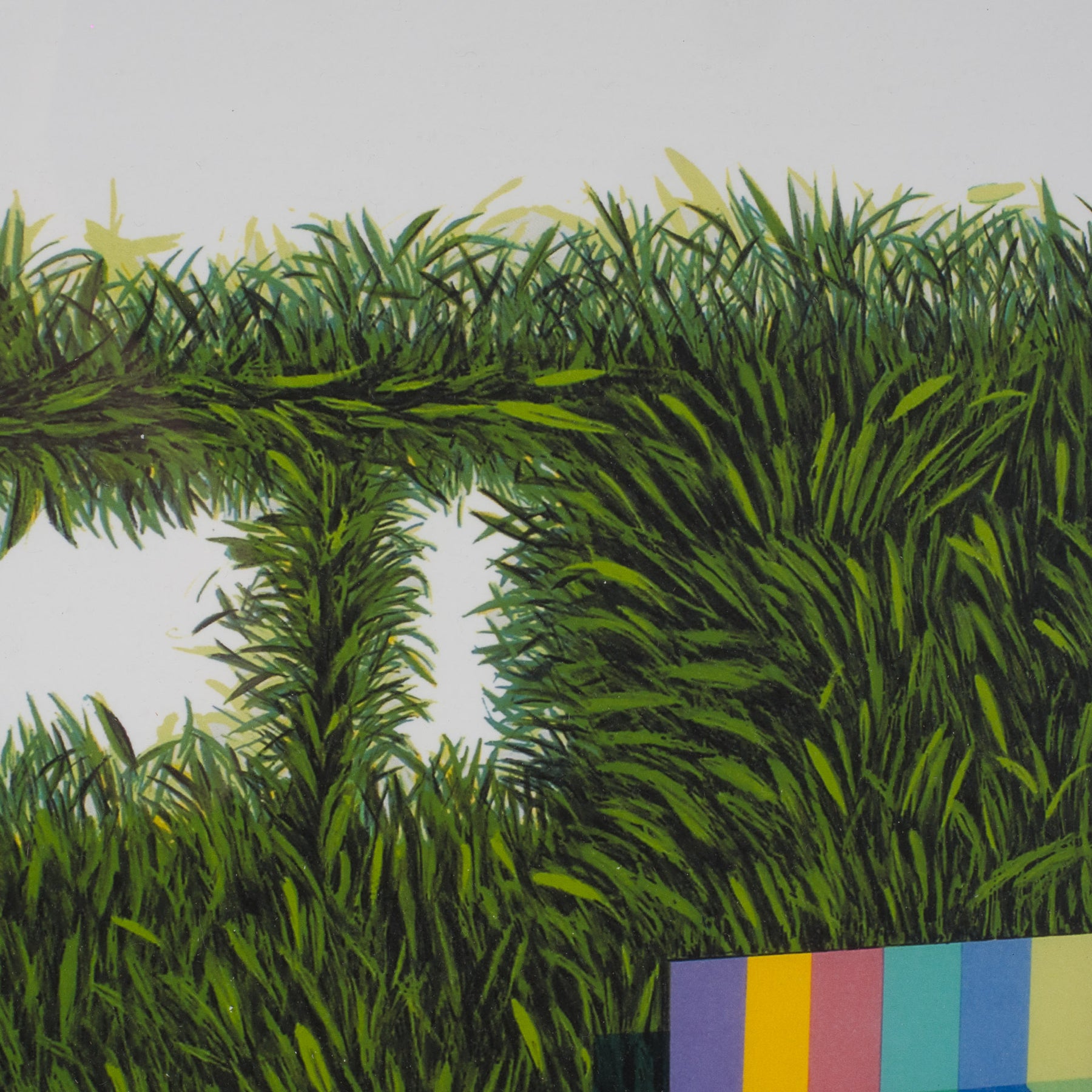 This unique lithograph by West Flemish artist Elias is a striking and substantively powerful work that playfully blends nature, form, and symbolism. The image depicts a van constructed entirely of fresh green blades of grass, with a colorful geometric element in rainbow hues at its center. An intriguing contrast between organic growth and sleek design.