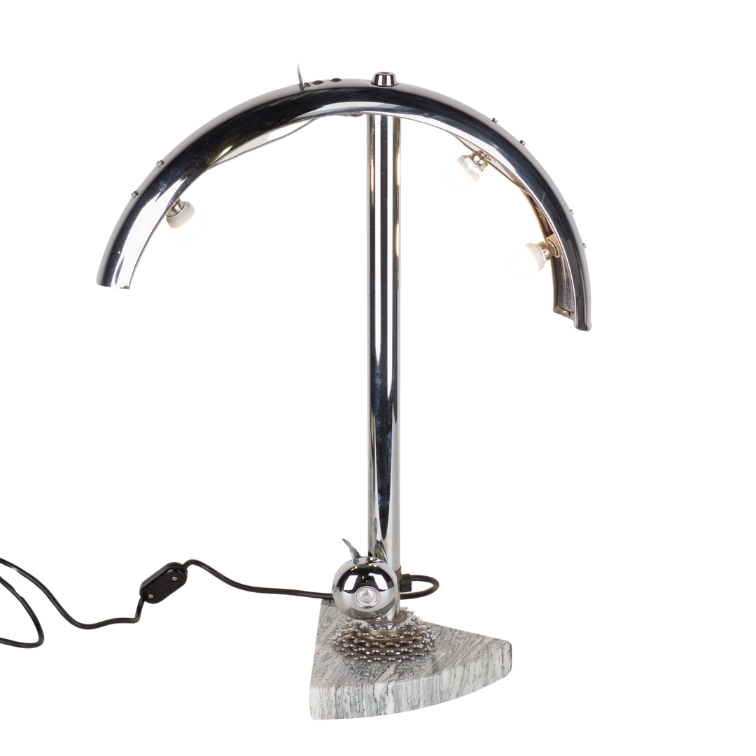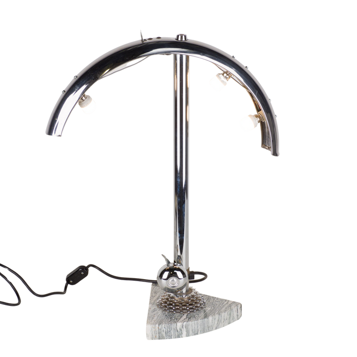 Discover the perfect combination of playfulness and elegance with our curved metal table lamp with bicycle bell on a gray marble base!
