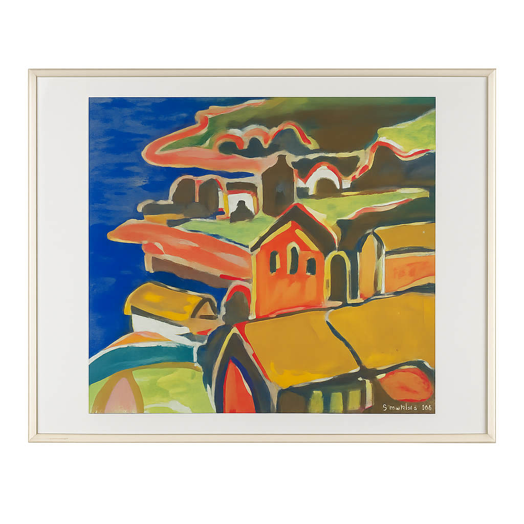 Schilderij “Huizen aan Zee – Kobaltblauw Landschap” door S. Matthijs