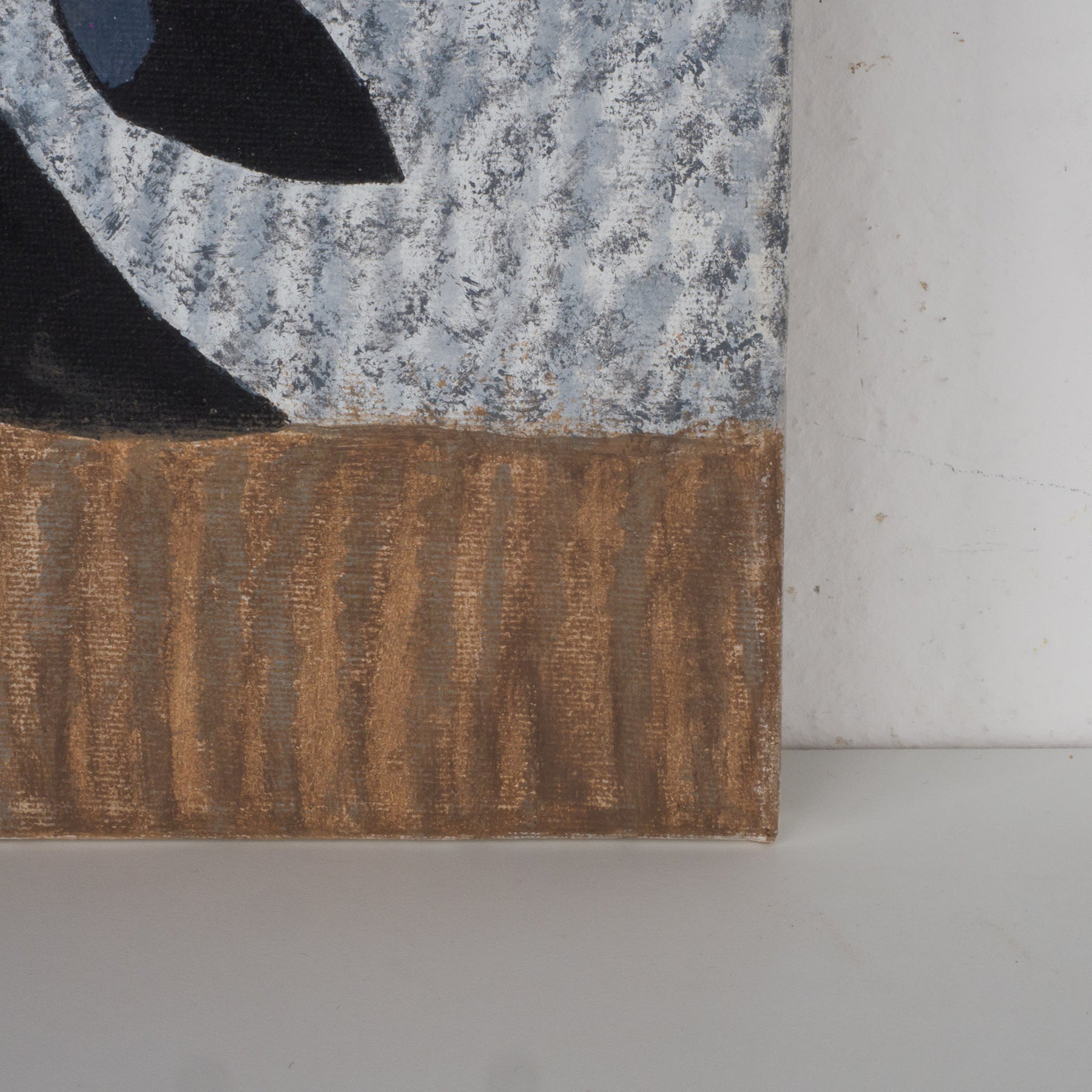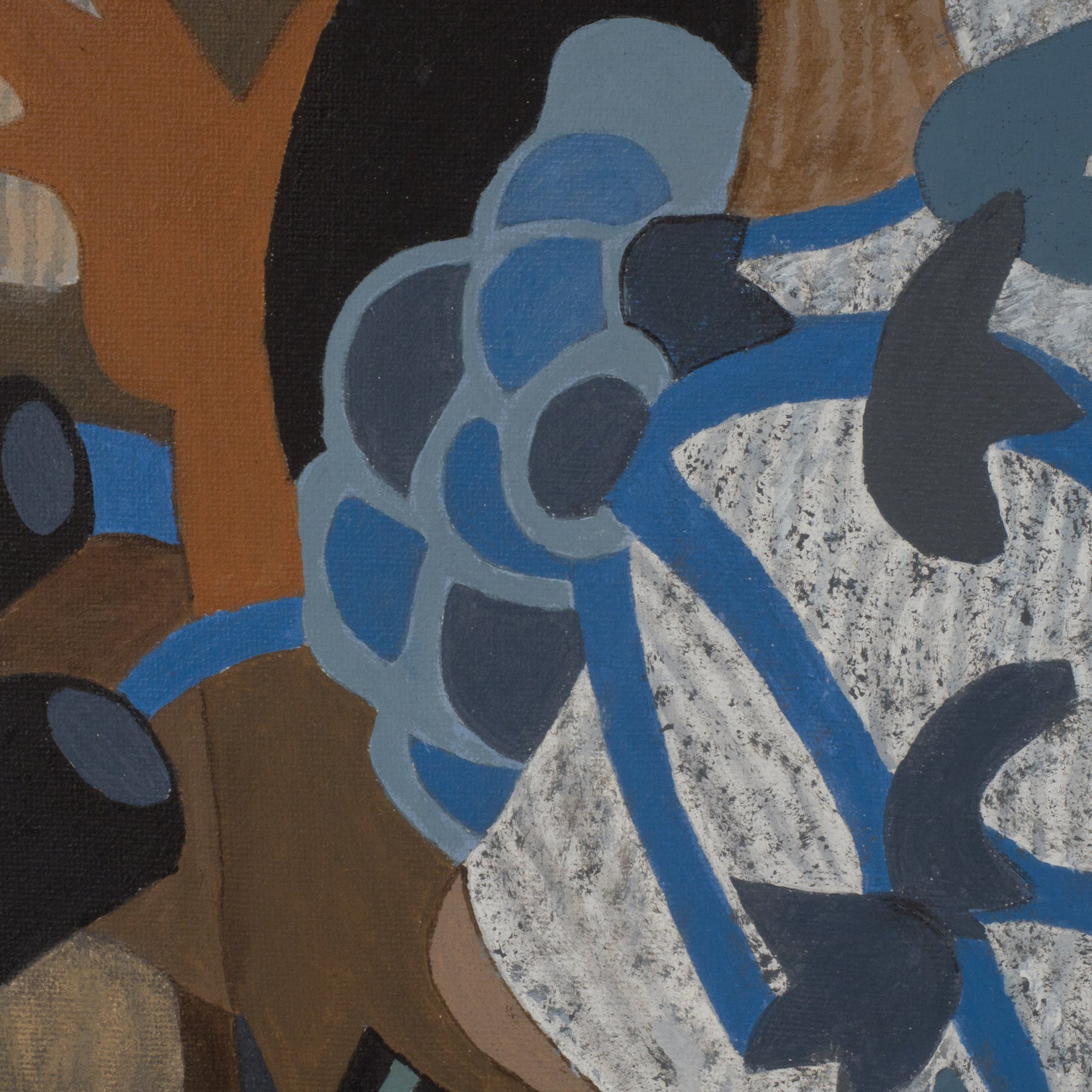 De compositie is strak en doordacht, terwijl de kleuren zorgen voor spanning en diepte. Blauwe accenten brengen rust en structuur, terwijl de warme oranje en bruine tonen het werk energie en karakter geven. De gelaagdheid en het ritme van de vormen nodigen uit tot langer kijken en laten ruimte voor interpretatie — precies wat dit type kunst zo boeiend maakt.