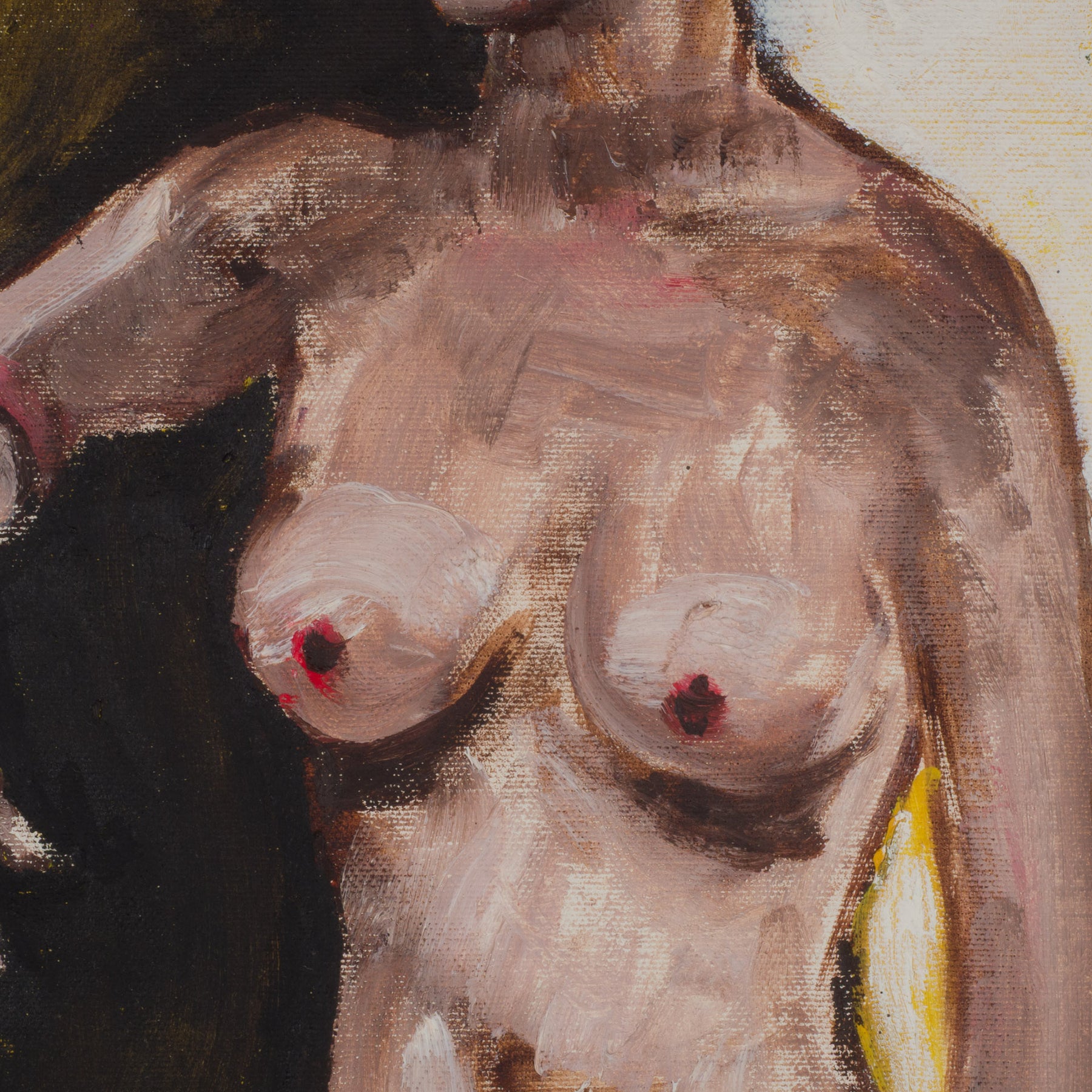 Het kleurgebruik speelt een centrale rol in dit werk. Het warme geel van de achtergrond contrasteert sterk met de aardse huidtinten en de donkere accenten, waardoor de figuur zich losmaakt van de ruimte en tegelijk stevig verankerd blijft in het beeldvlak. Het koloriet is rijk maar niet opzichtig, met een expressieve penseelvoering die het schilderij een tastbare, menselijke kwaliteit geeft.