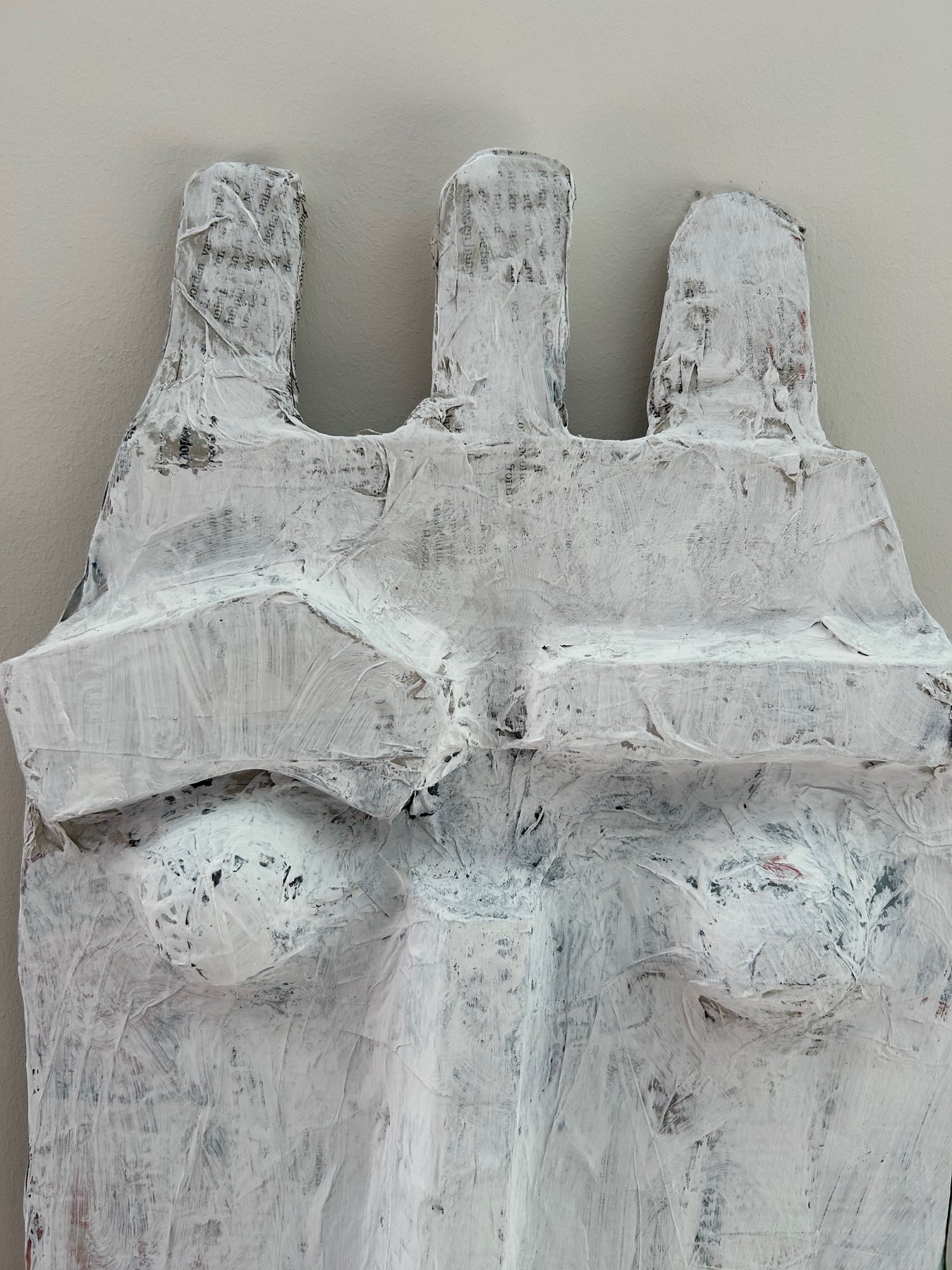 - Kleur: wit, met zichtbare textuur en onderliggende lagen