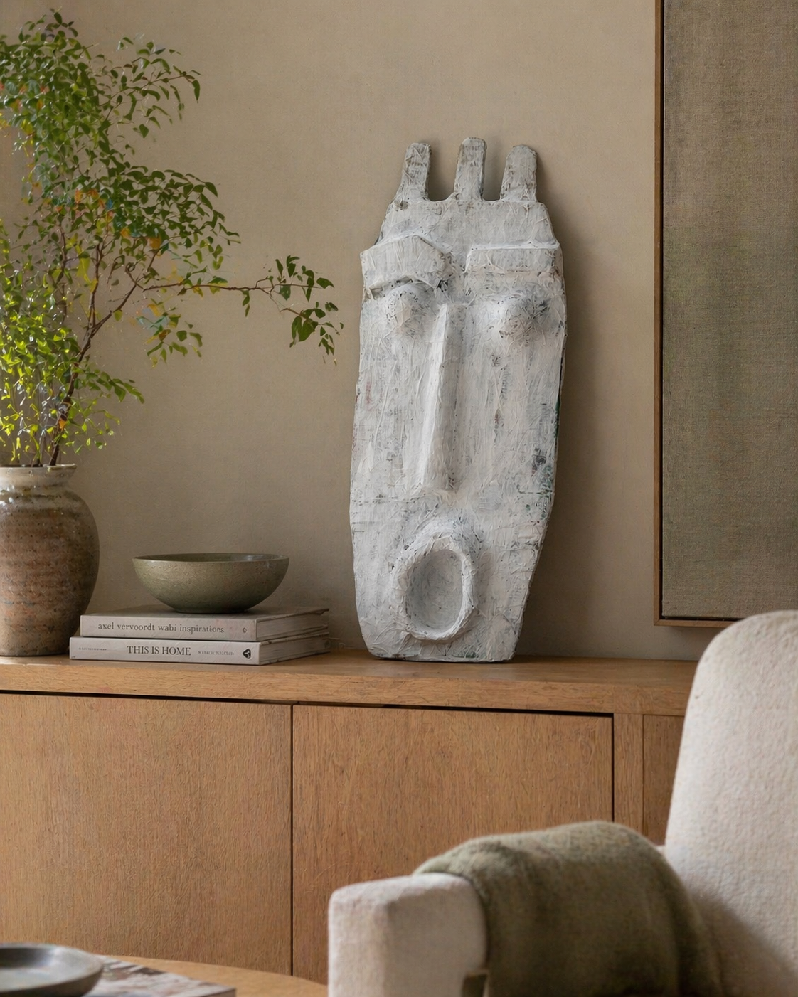 Dit masker voelt voor mij als een zachte pauze. Het heeft iets beschermends, bijna ceremonieel. Alsof het een herinnering draagt aan wie we zijn zonder maskers — kwetsbaar, puur en onopgesmukt. Het is geen luid kunstwerk, maar eentje dat langzaam binnenkomt en blijft.