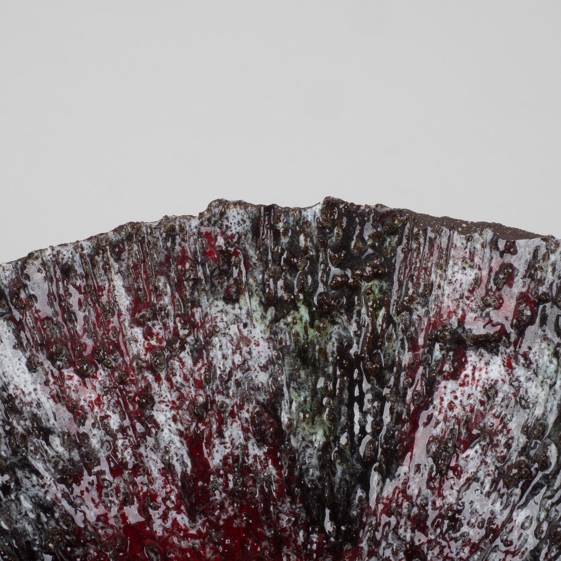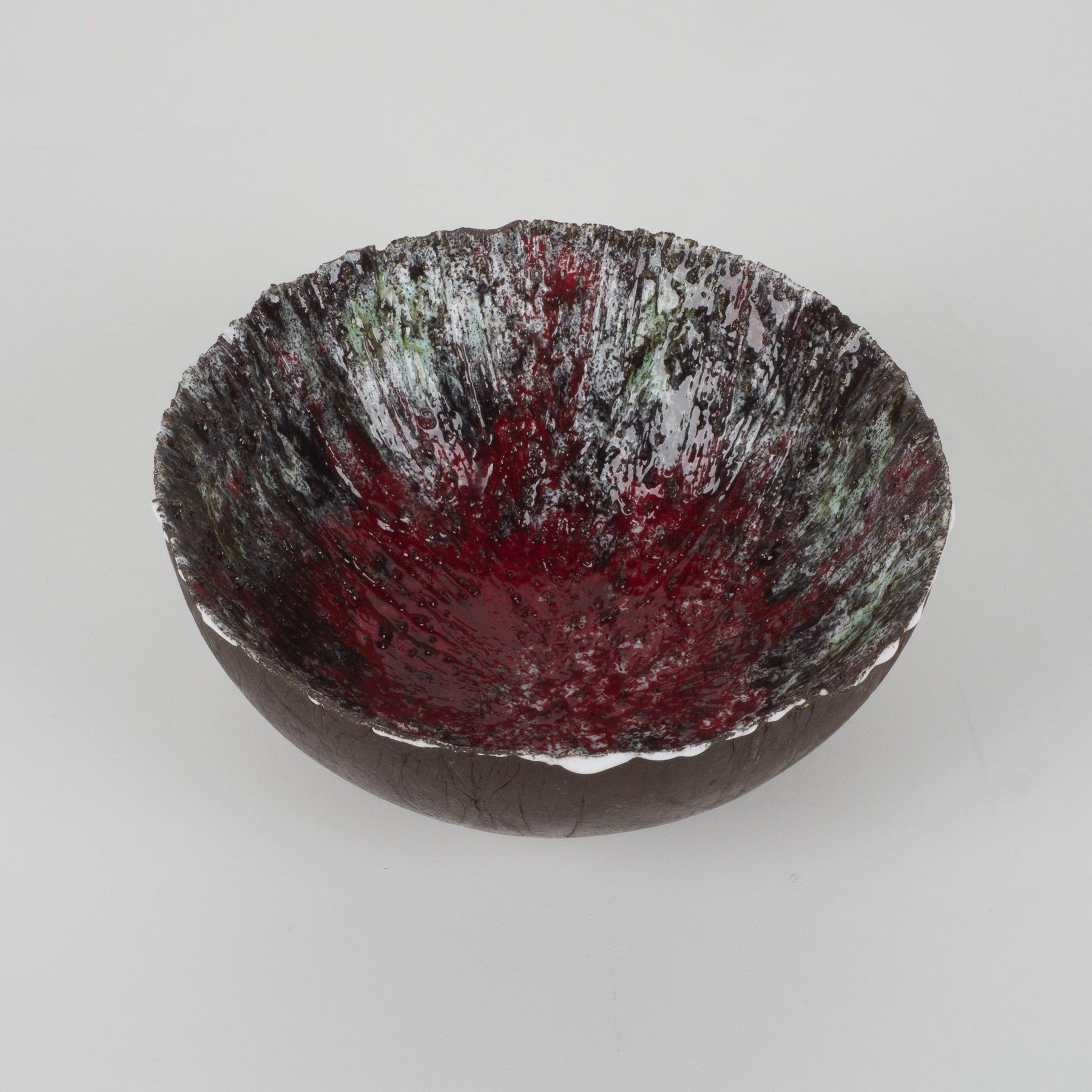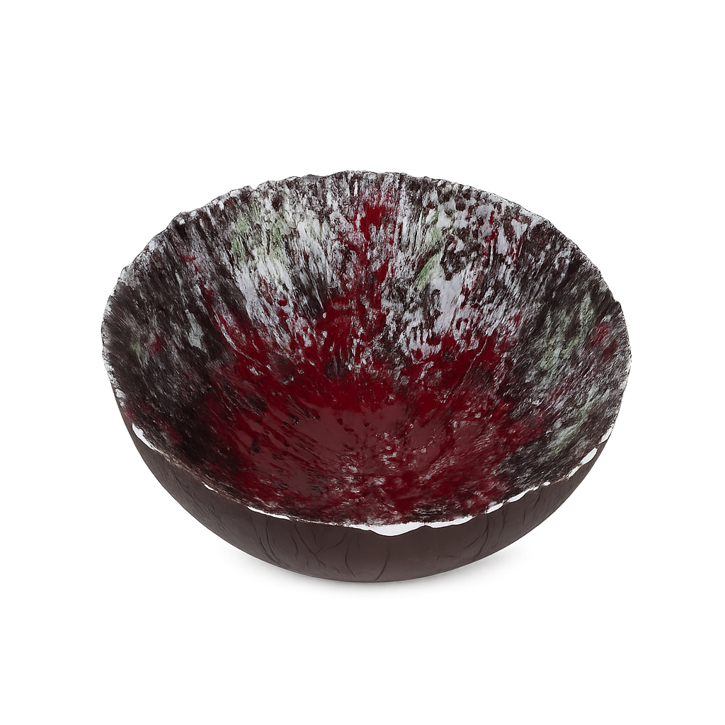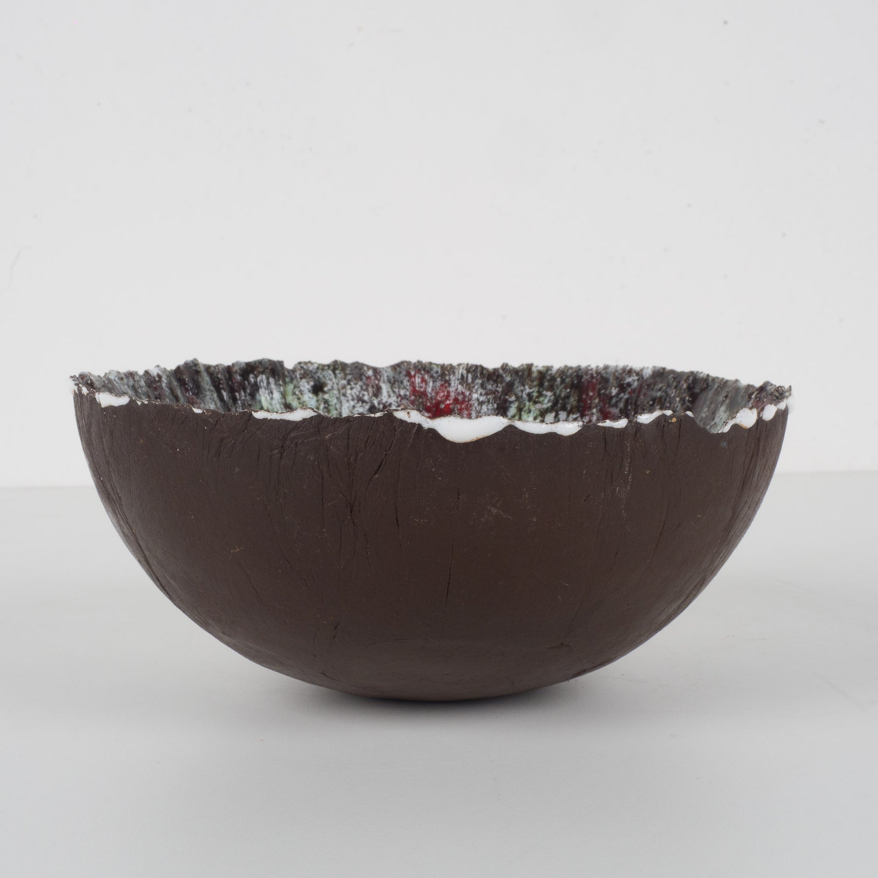 De buitenzijde is uitgevoerd in een warme, diepe bruine tint met een natuurlijke, aardse uitstraling. De binnenkant daarentegen verrast met een explosie van kleur en structuur: rood, wit, groen en donkerbruin vloeien samen in een dynamisch, bijna vulkanisch glazuur. De reliëfachtige textuur en het druipende effect geven het schaaltje een ruwe, organische uitstraling — typisch voor de keramische experimenten uit de jaren ’60 en ’70.