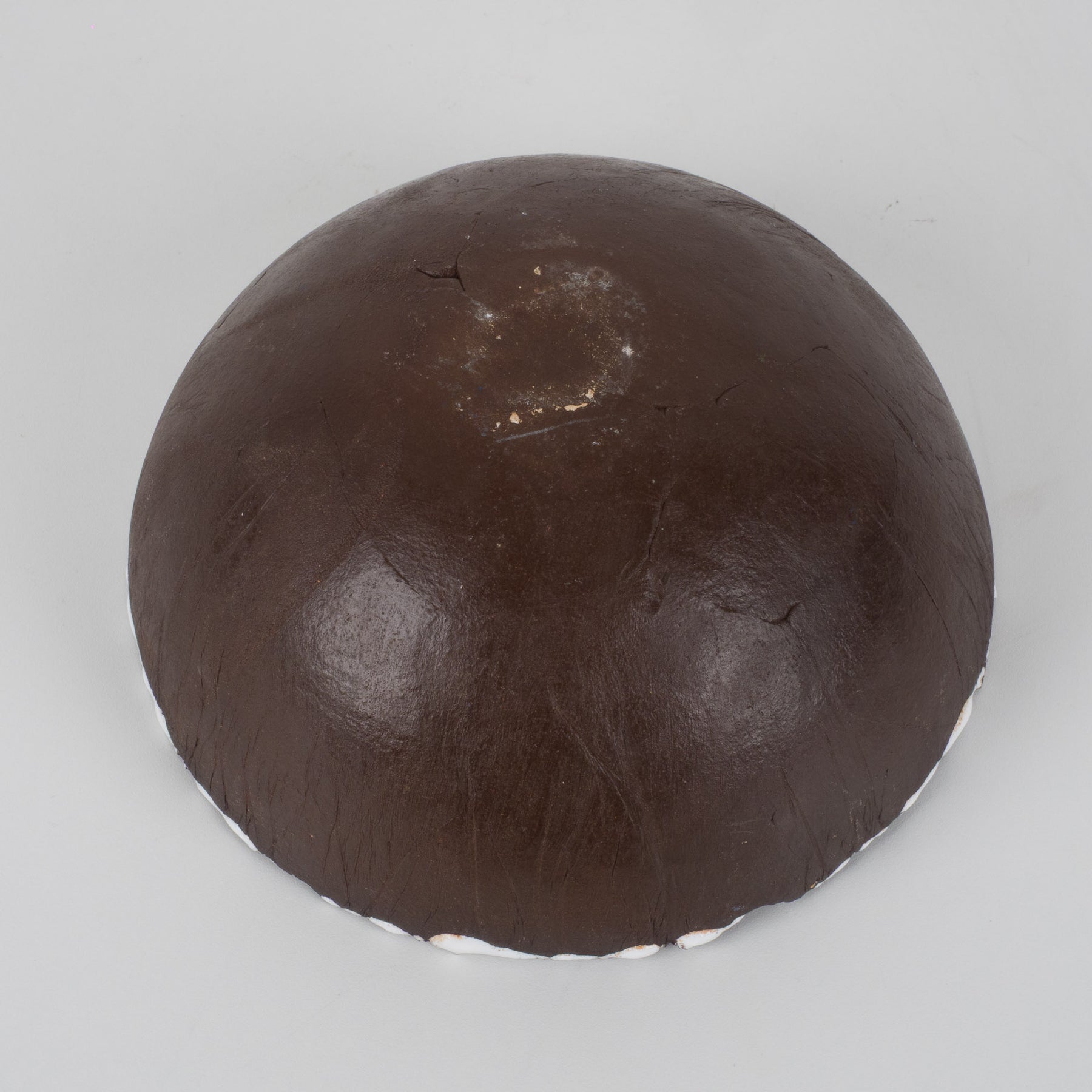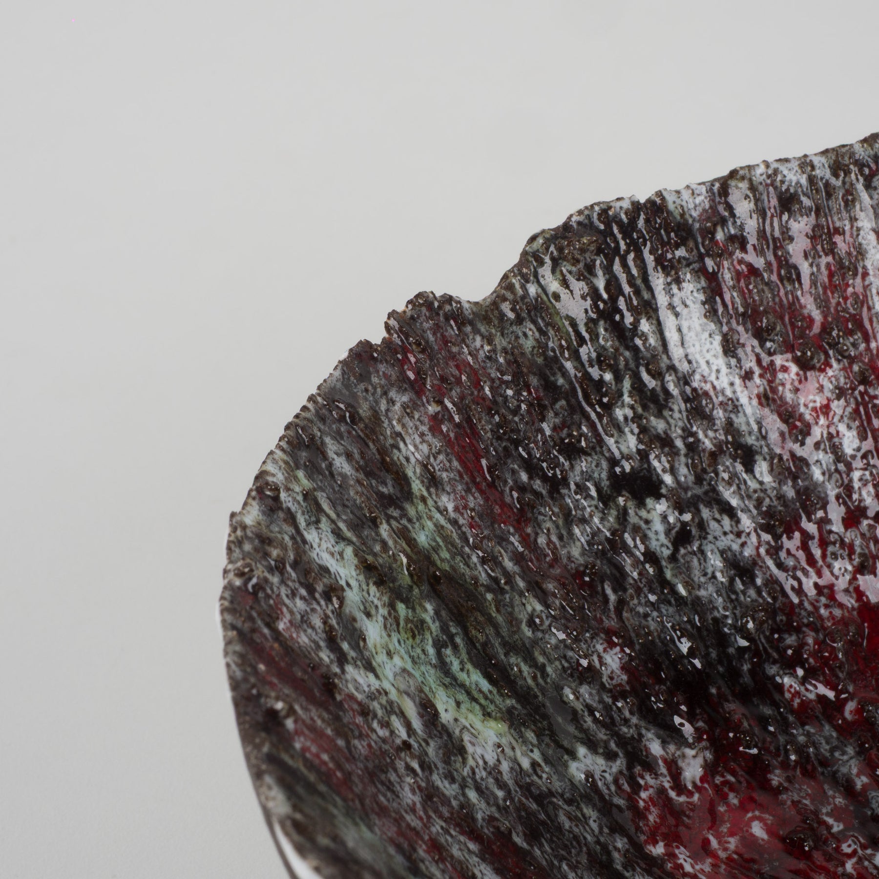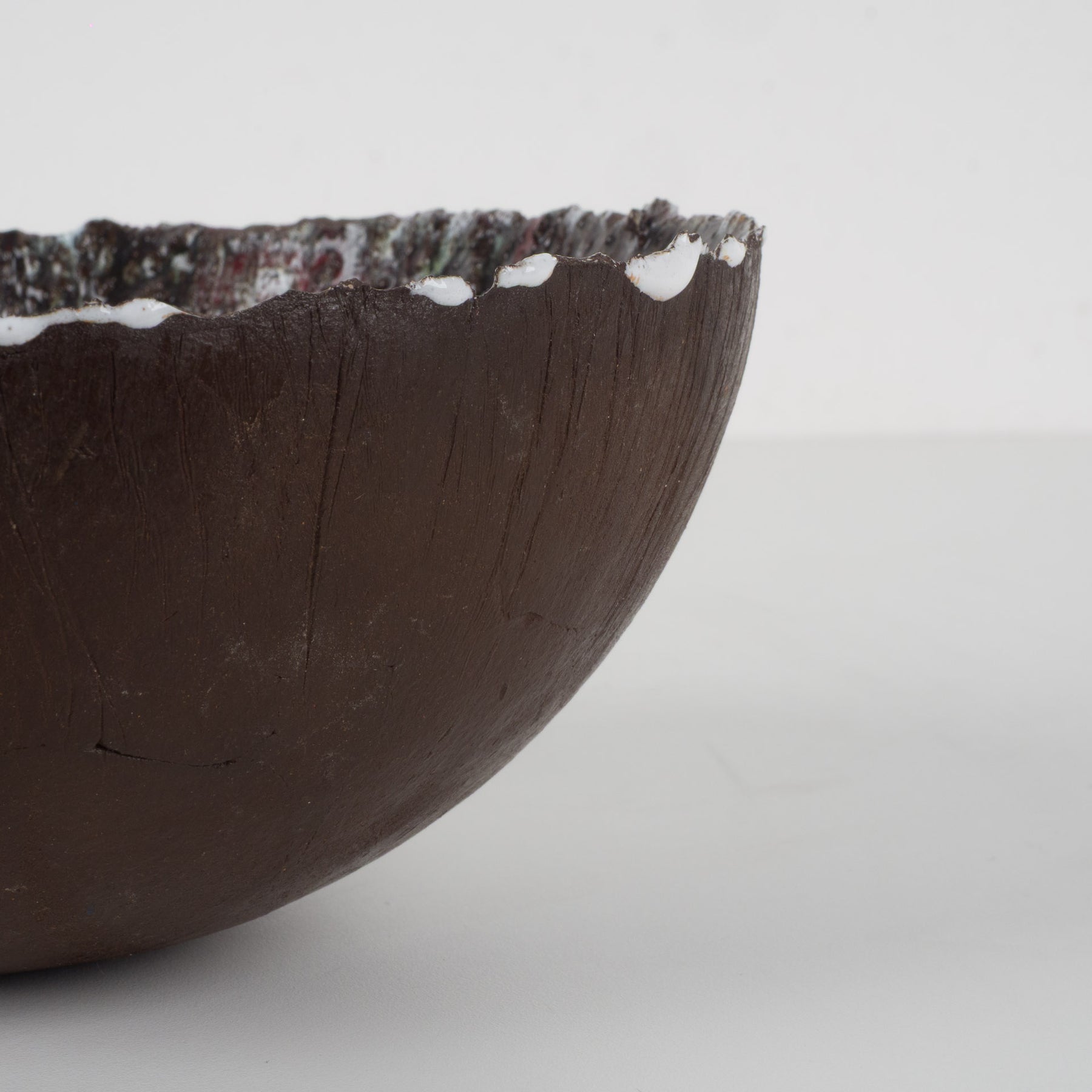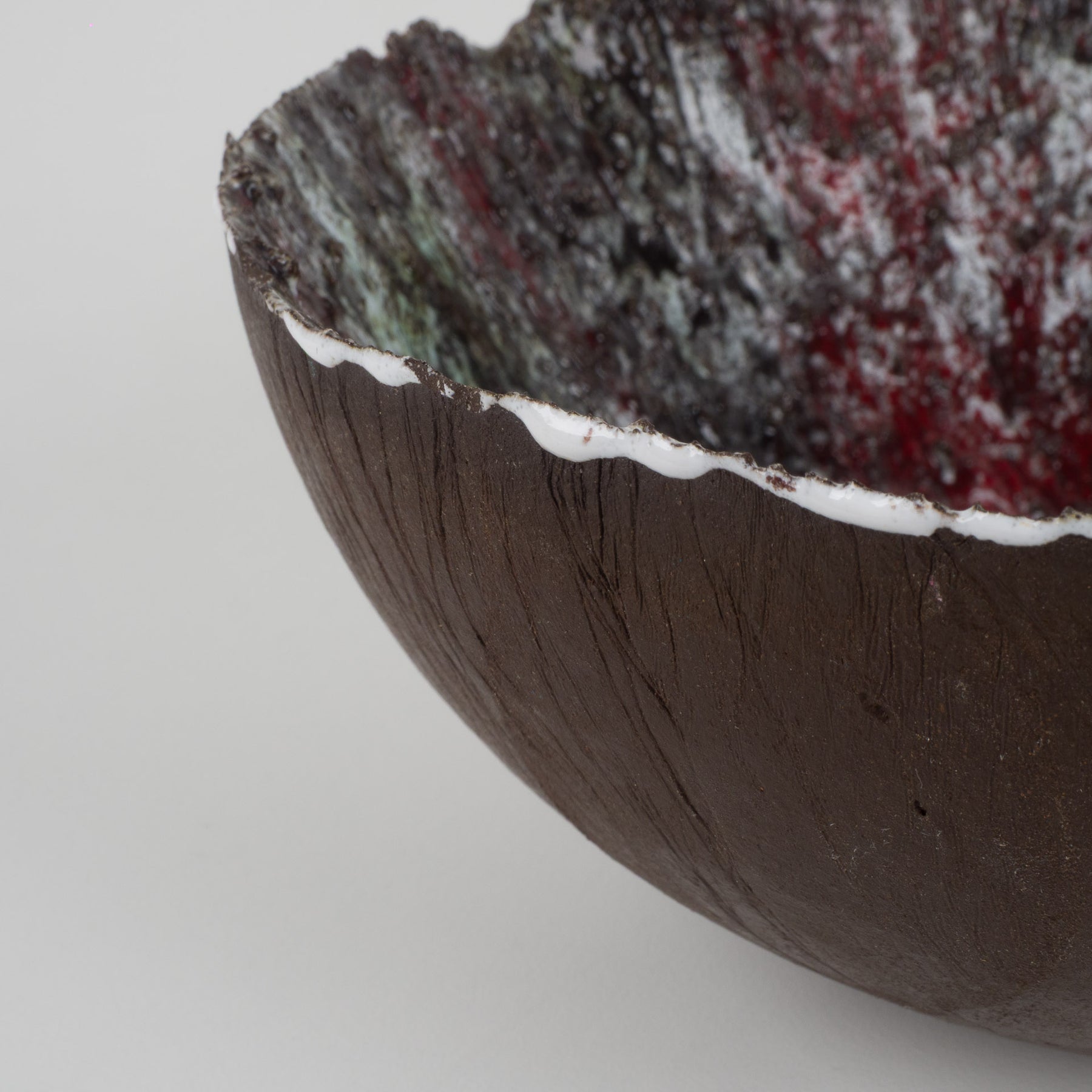 De buitenzijde is uitgevoerd in een warme, diepe bruine tint met een natuurlijke, aardse uitstraling. De binnenkant daarentegen verrast met een explosie van kleur en structuur: rood, wit, groen en donkerbruin vloeien samen in een dynamisch, bijna vulkanisch glazuur. De reliëfachtige textuur en het druipende effect geven het schaaltje een ruwe, organische uitstraling — typisch voor de keramische experimenten uit de jaren ’60 en ’70.