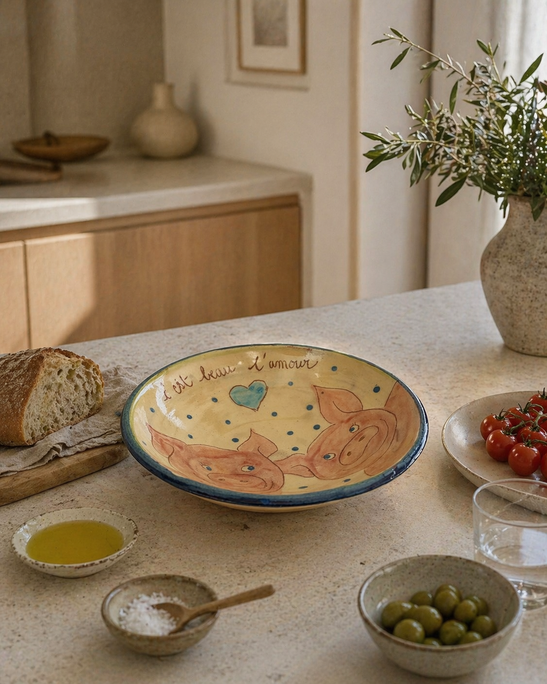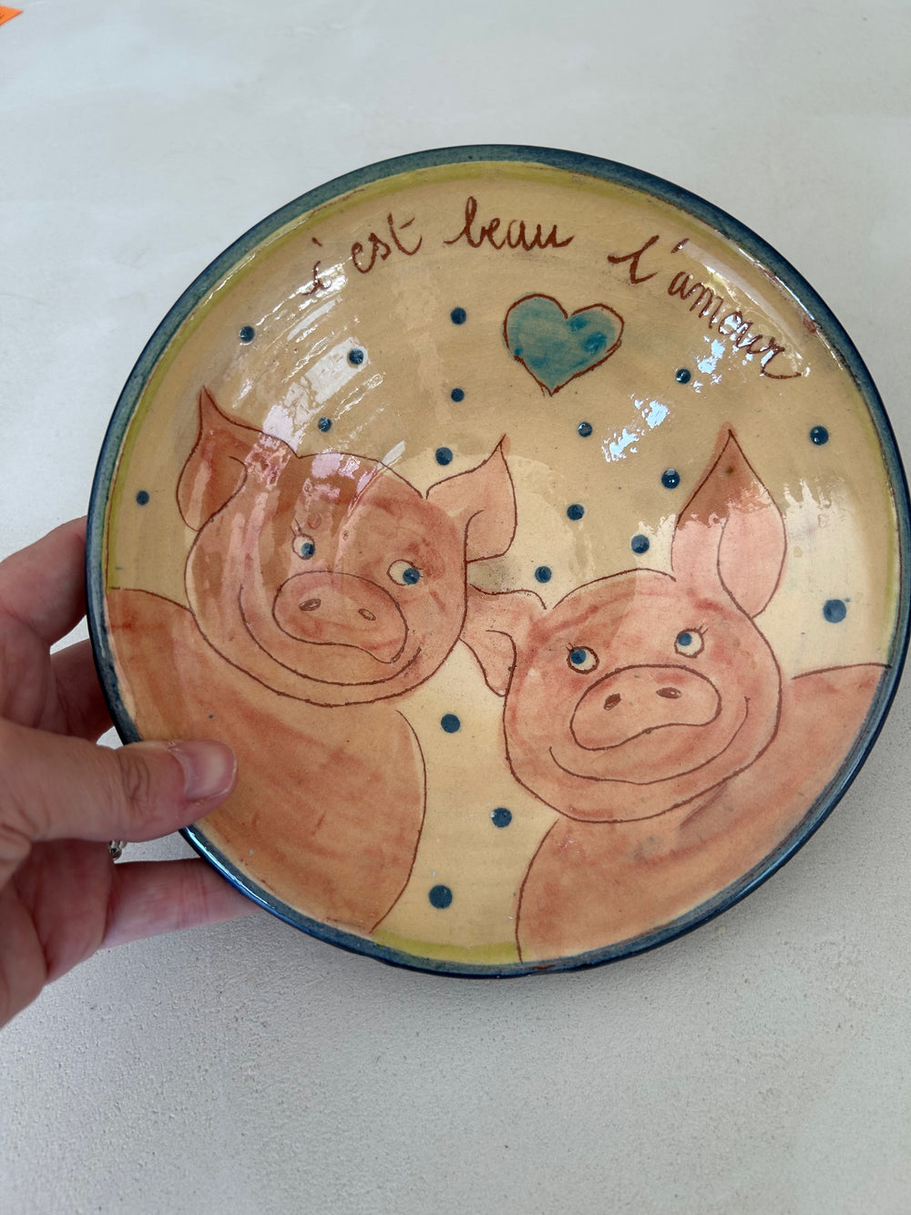 Handgemaakt geglazuurd keramisch bord “C’est beau l’amour”