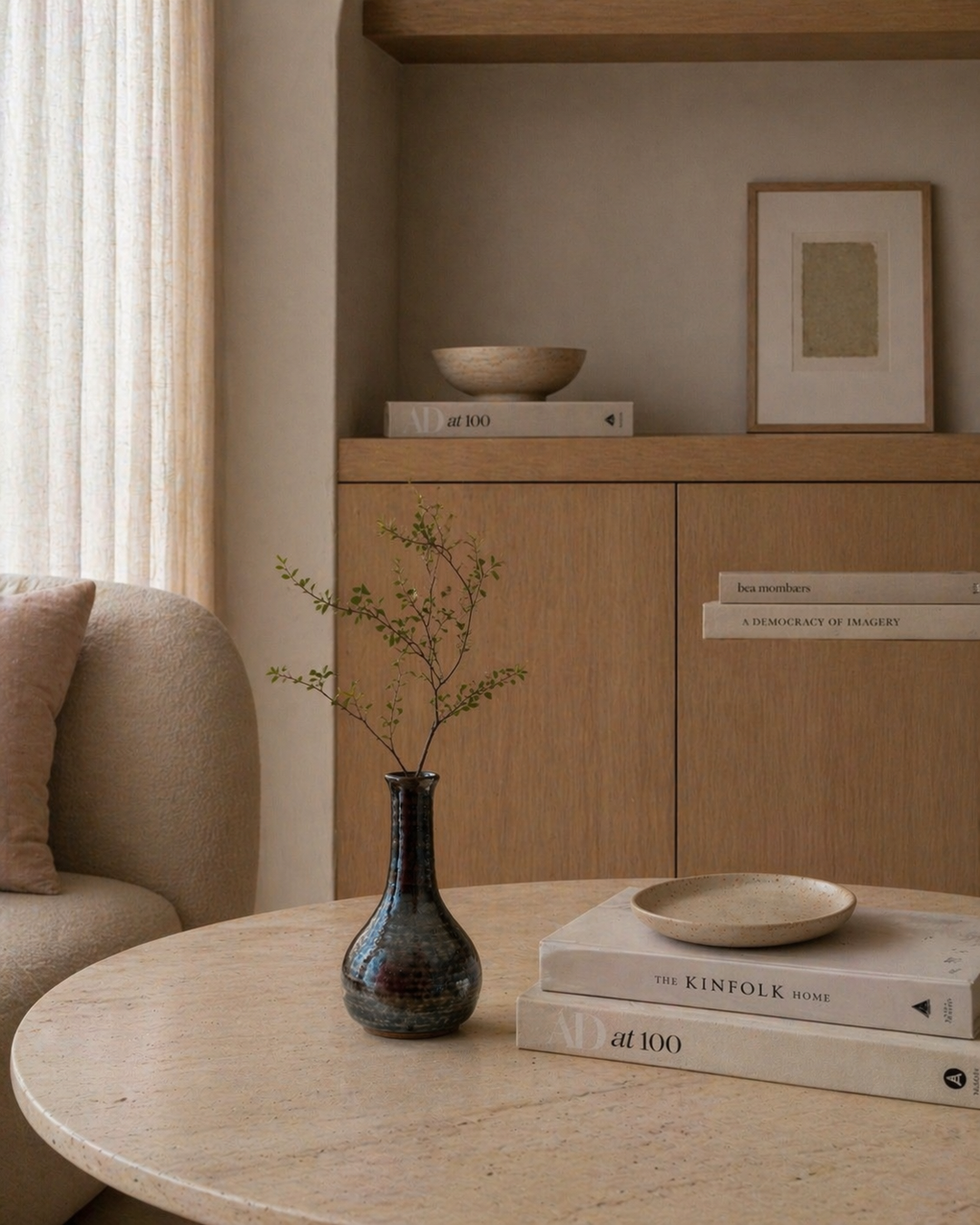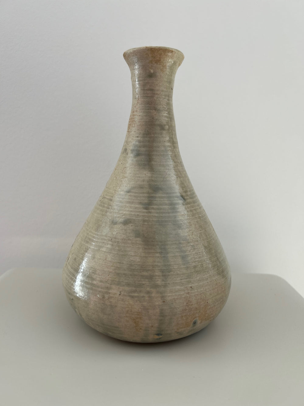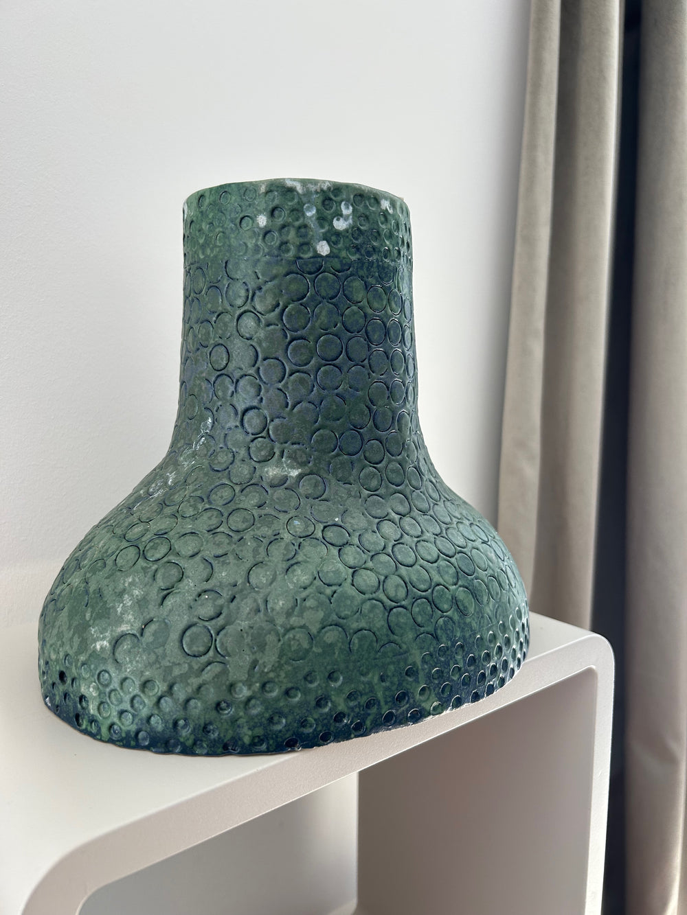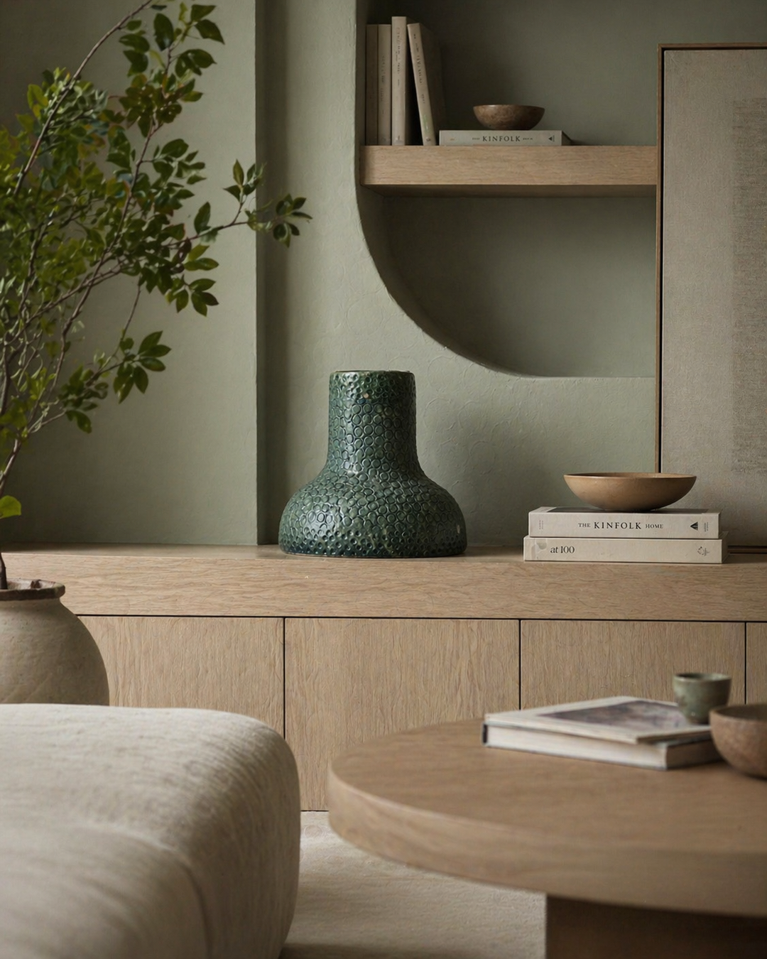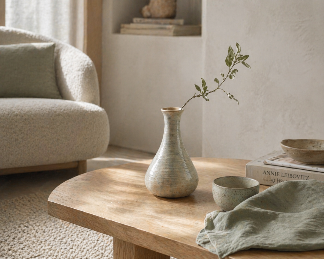 Fluistering in Greige – Handgemaakt Keramisch Vaasje met Zachte Groene Wolking