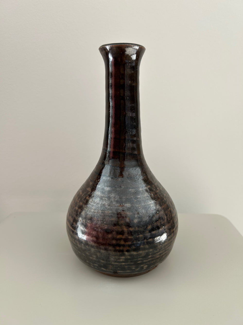 Handgemaakt keramisch vaasje – bruin met blauw geglazuurd blad – gesigneerd – 6 x 5,5 x 15 cm