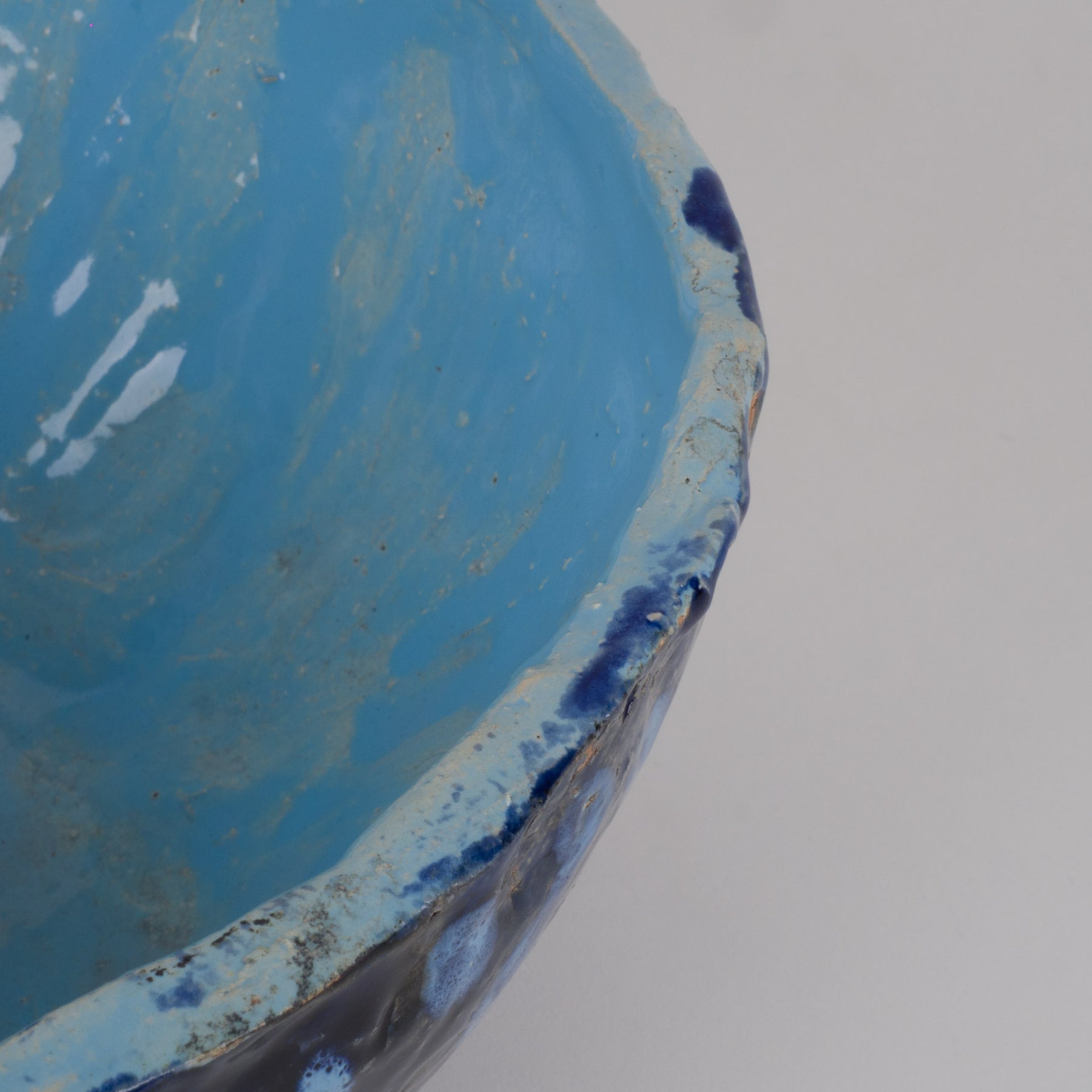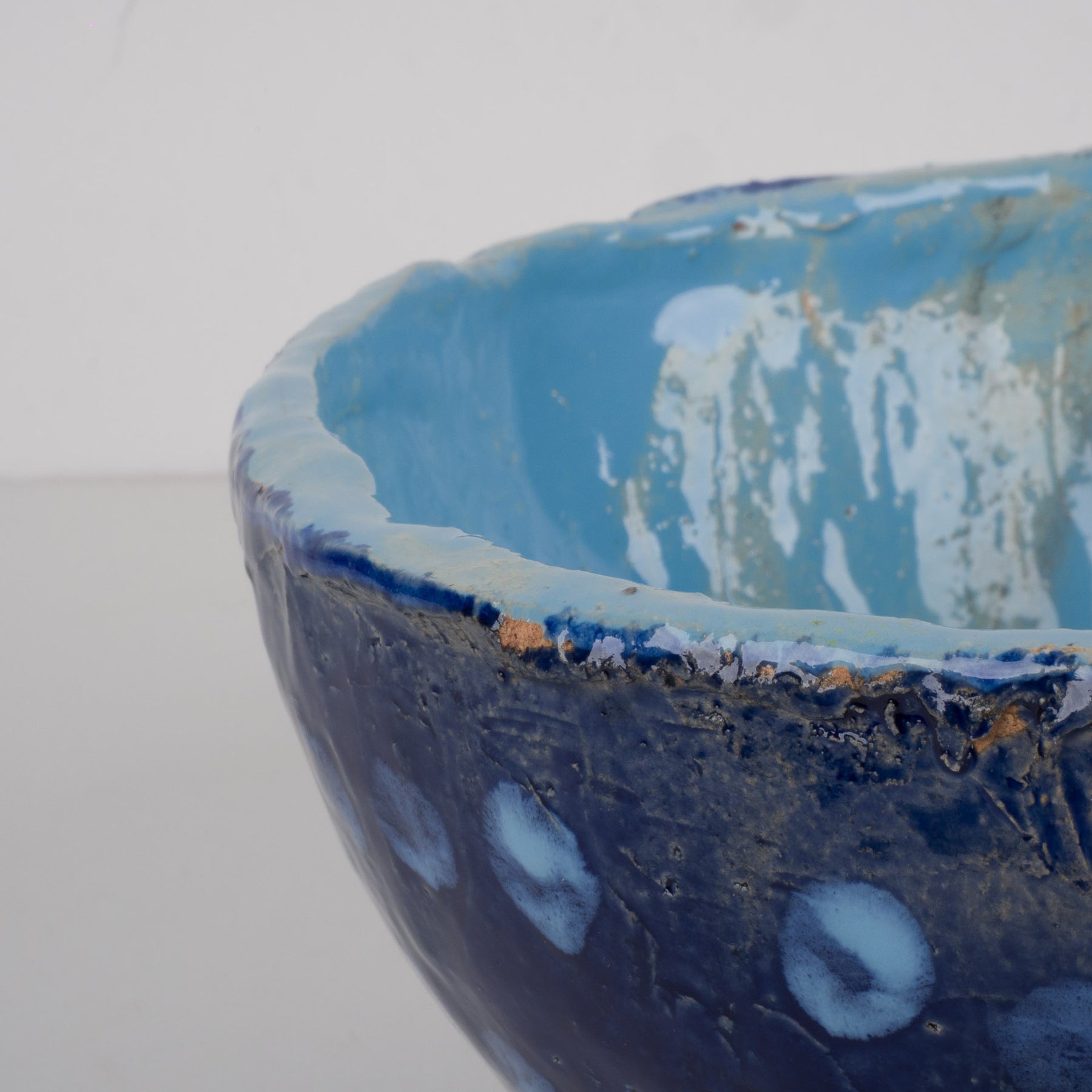 Deze handgemaakte keramische schaal van Jan Deceuninck is een krachtig en authentiek object met karakter. Met haar diepe kobaltblauwe buitenzijde, speelse lichtblauwe stippen en zacht turquoise binnenkant straalt ze zowel rust als expressie uit. De organisch gevormde rand en subtiele onregelmatigheden benadrukken het ambachtelijke proces en maken elk detail uniek.