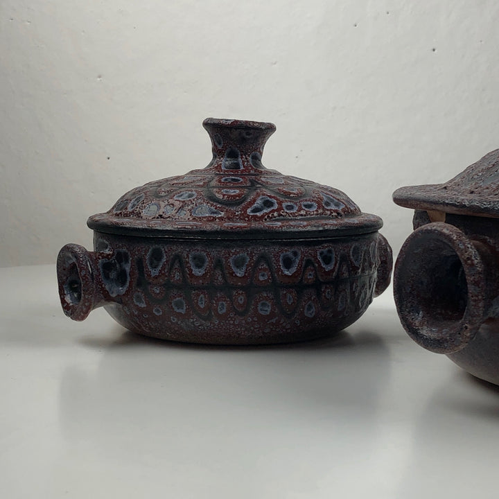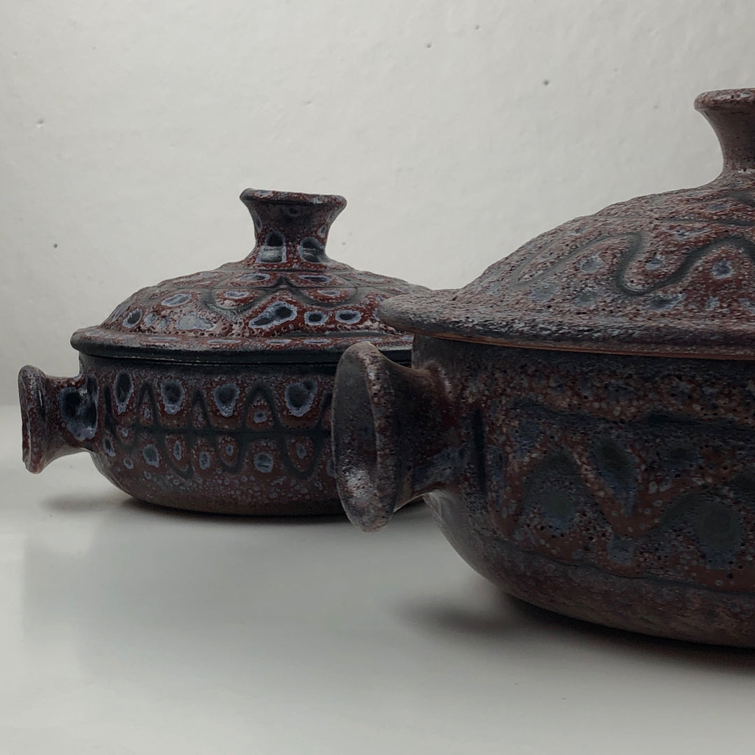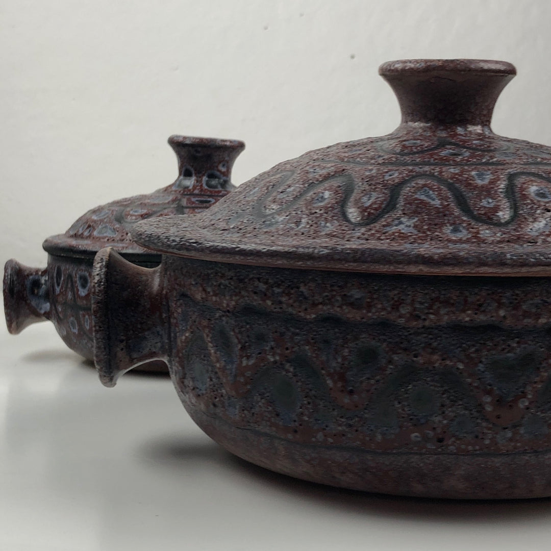Hoewel de set in een algemene goede staat verkeert, is er een klein stukje weg van de grootste pot (zie foto's). Dit doet echter niets af aan de charme en schoonheid van deze unieke stukken. De gebruikssporen dragen juist bij aan de authenticiteit en het karakter van het werk van Jean Austruy.