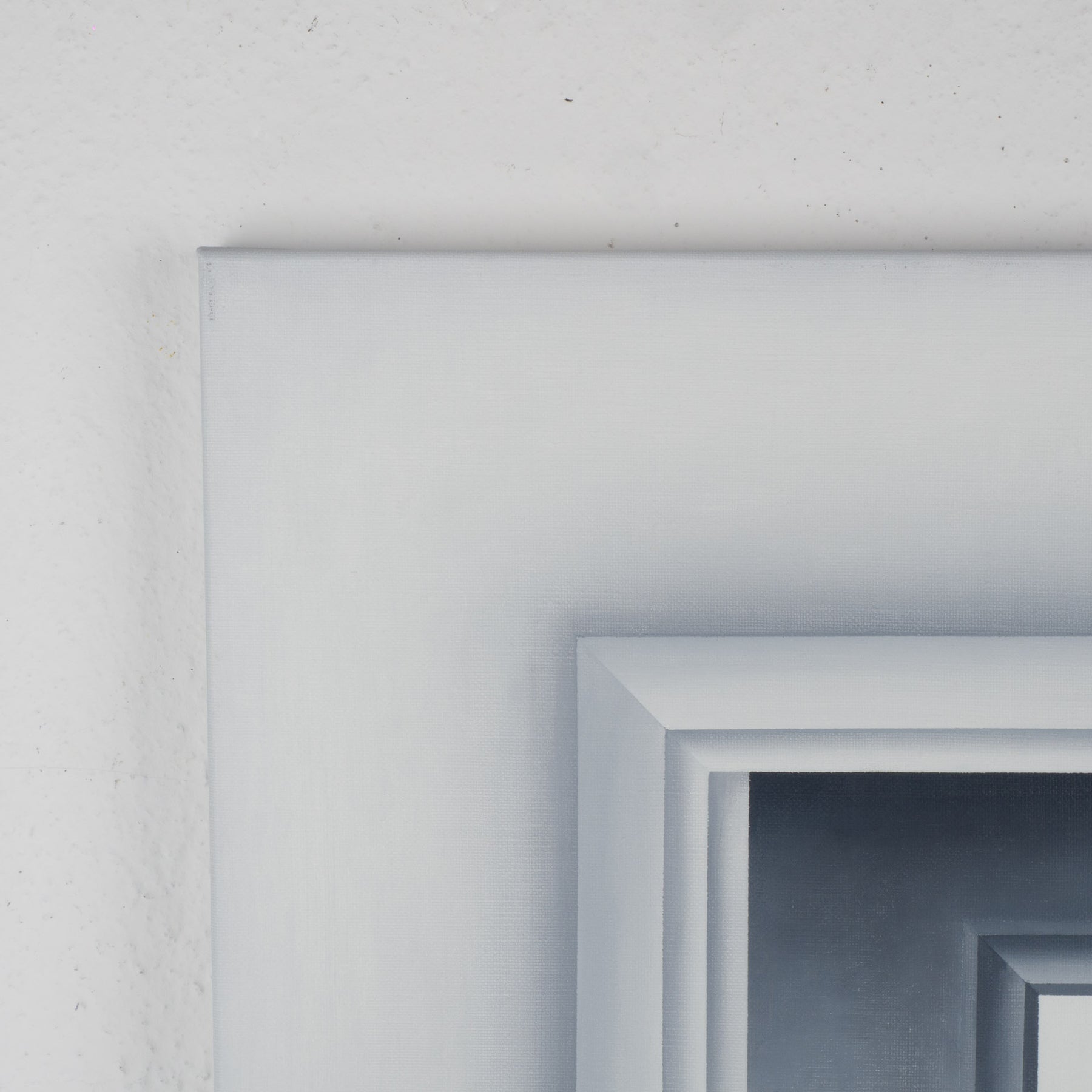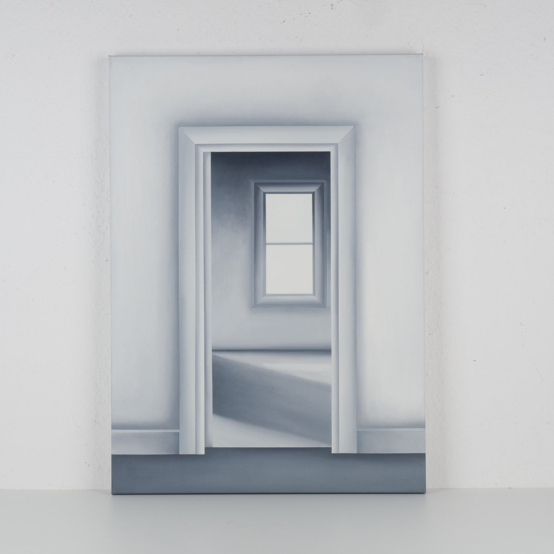 Dit intrigerende schilderij “Architectural Silence – nr. 3” van Monique Coppieters neemt de kijker mee in een gelaagde ruimte waarin architectuur, licht en perspectief op een verstilde manier samenkomen. De compositie toont een opeenvolging van deuropeningen die elkaar lijken te herhalen, als een visuele echo die de blik steeds dieper het beeld in trekt.