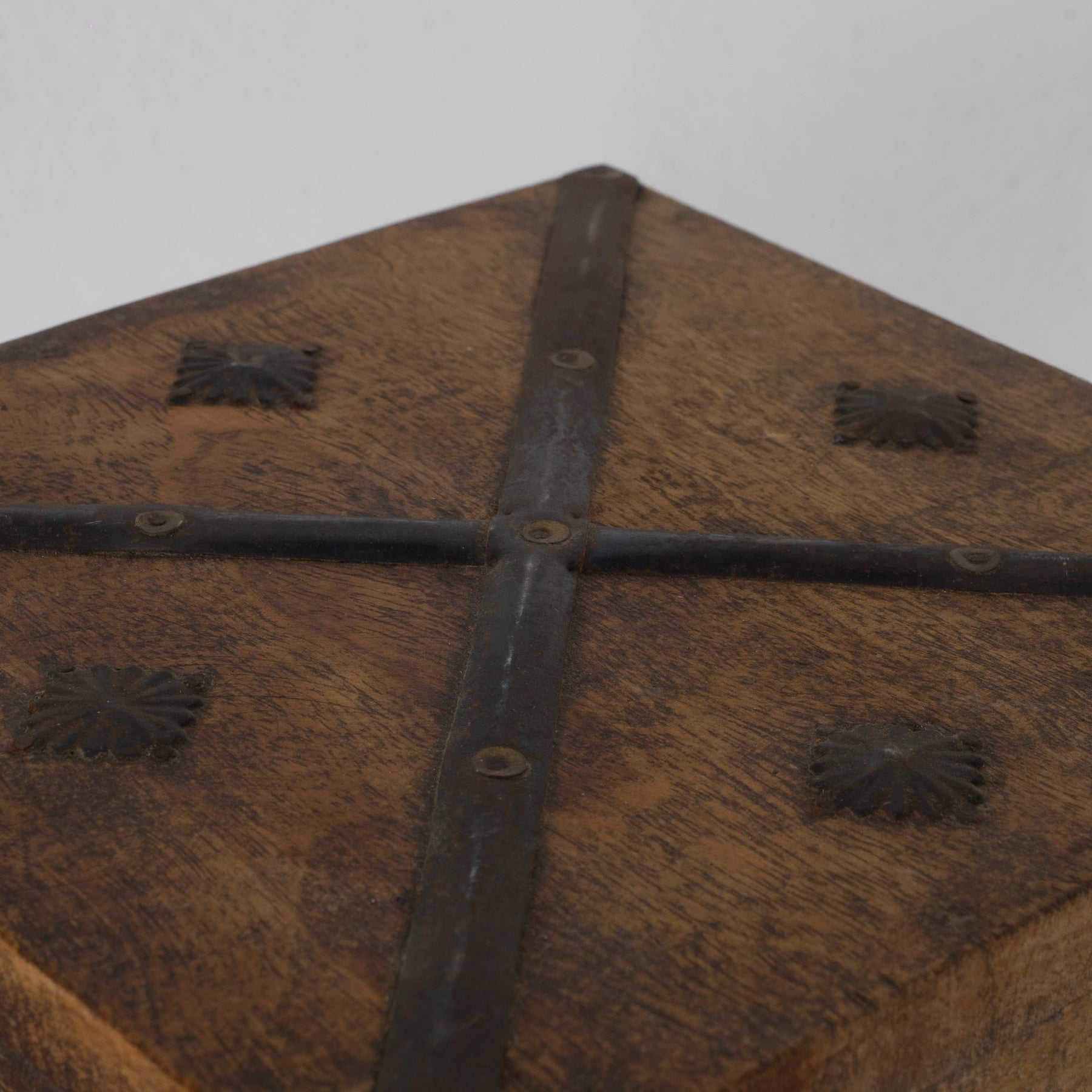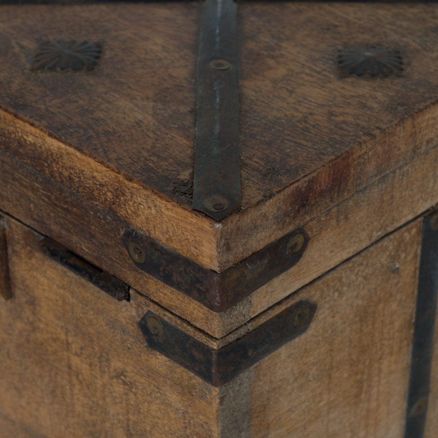 De robuuste metalen beslagstroken en hoekverstevigingen geven de kist een stoere, koloniale uitstraling. De combinatie van het warme hout en het donkere metaal zorgt voor een tijdloos contrast. De zichtbare nerven, gebruikssporen en subtiele patina versterken het authentieke karakter en geven het object een doorleefde charme.