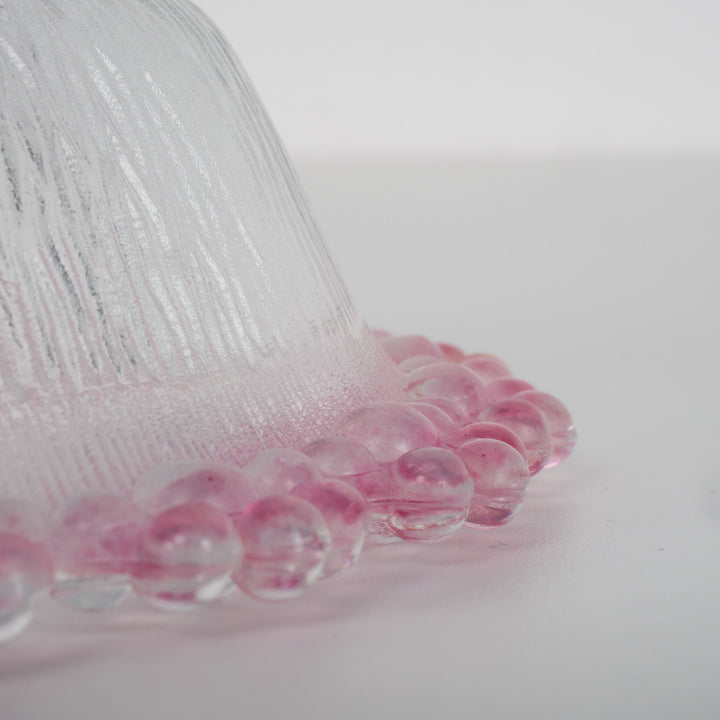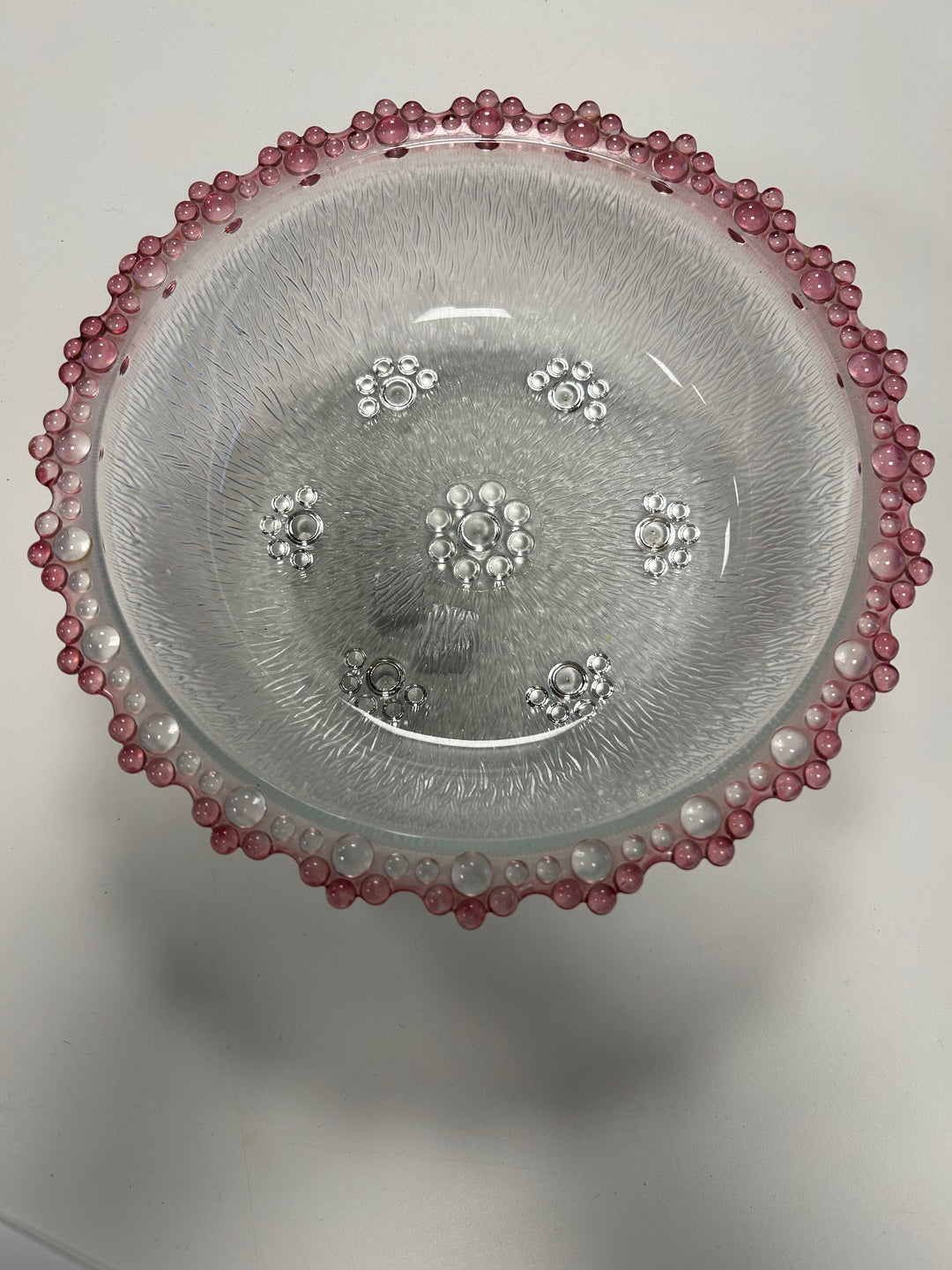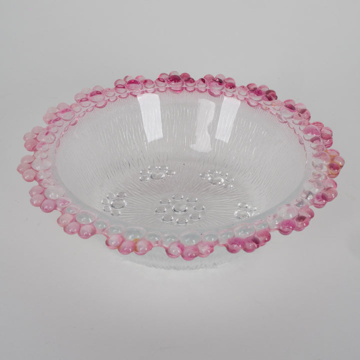 Elegante vintage schaal van wit mat glas met roze kraaltjes, afkomstig van Italla, Italië. Deze bijzondere schaal heeft een verfijnde uitstraling dankzij het subtiele contrast tussen het matte glas en de decoratieve roze accenten.