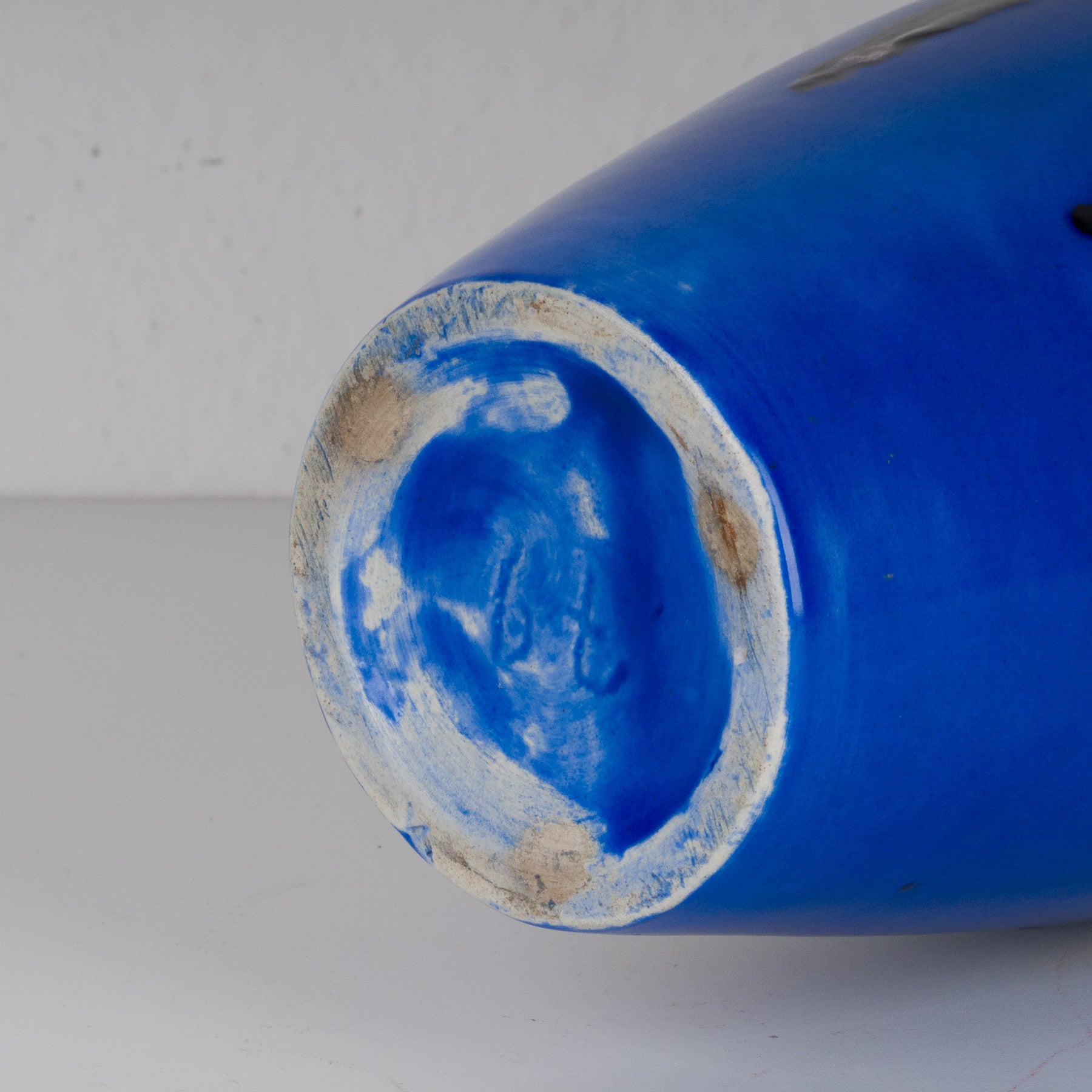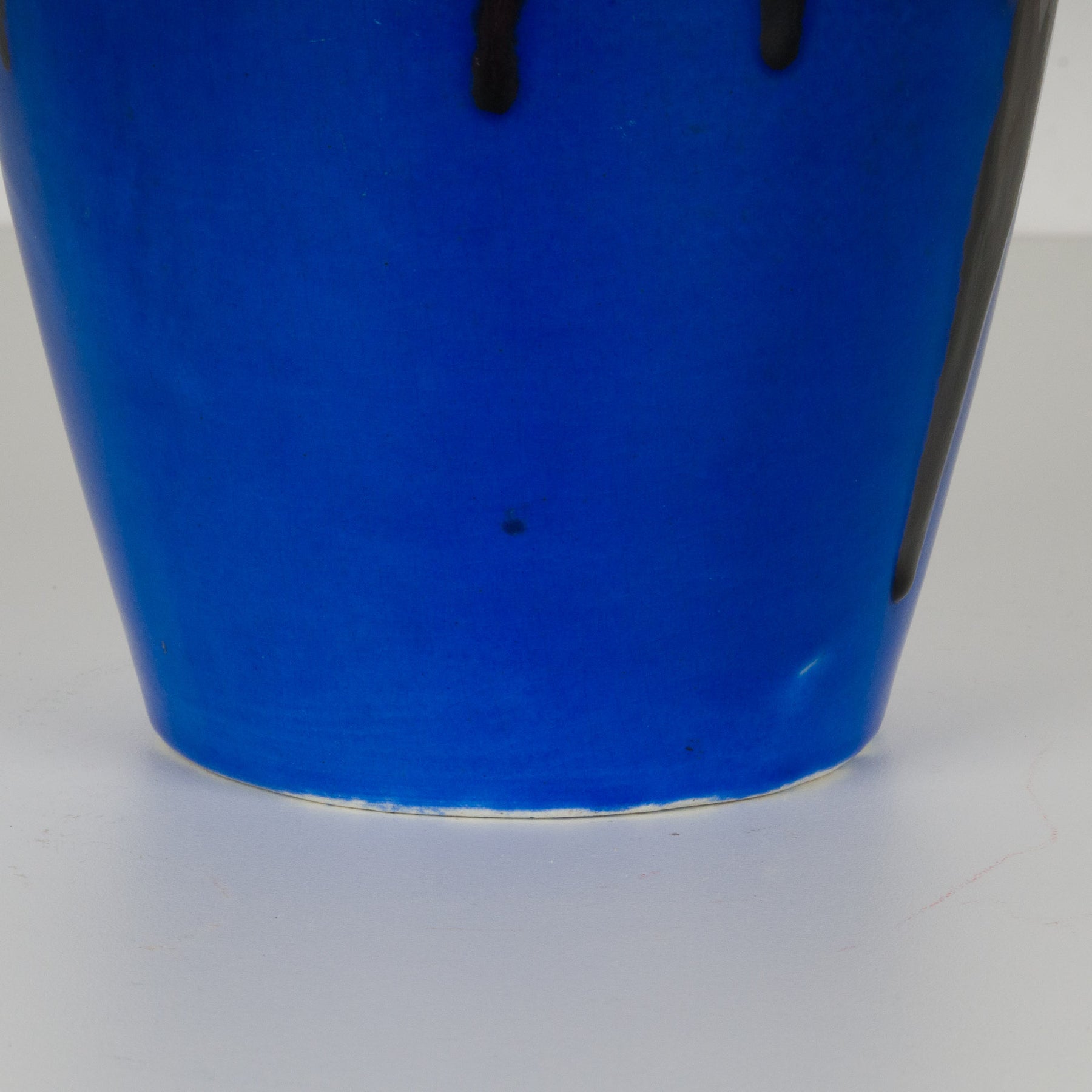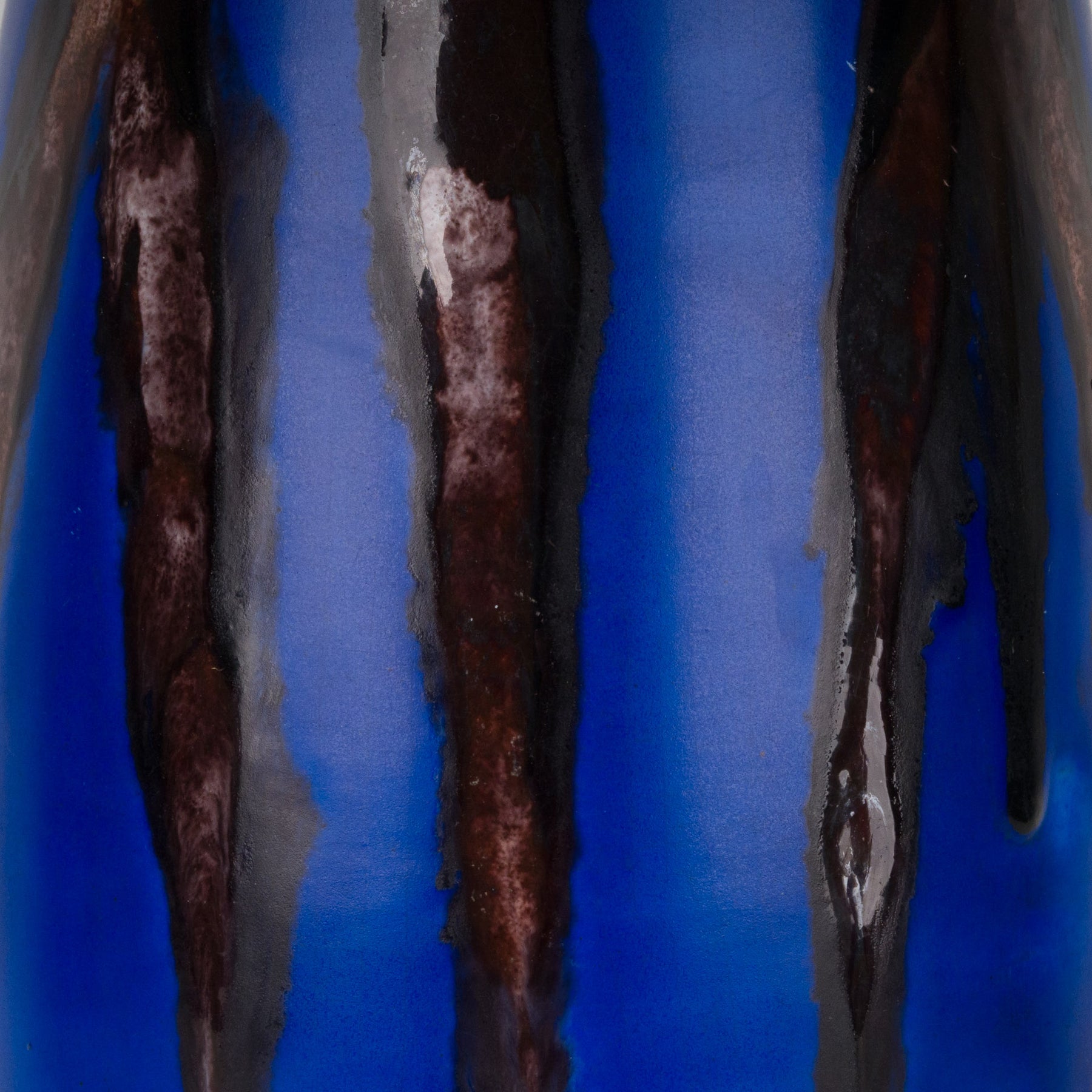 Deze prachtige keramische vaas in intens koningsblauw is een echte blikvanger voor elk interieur. Het diepe, verzadigde blauw wordt versterkt door expressief druipglazuur in donker bordeauxrood, dat als vloeiende accenten verticaal over de vorm loopt. Het resultaat is een krachtig en tegelijk verfijnd samenspel van kleur, glans en textuur.