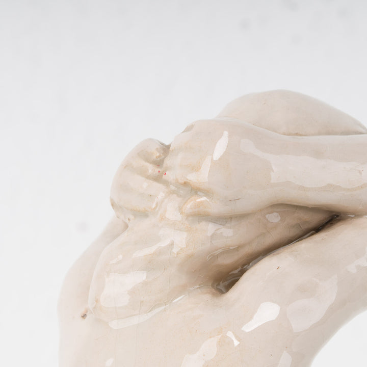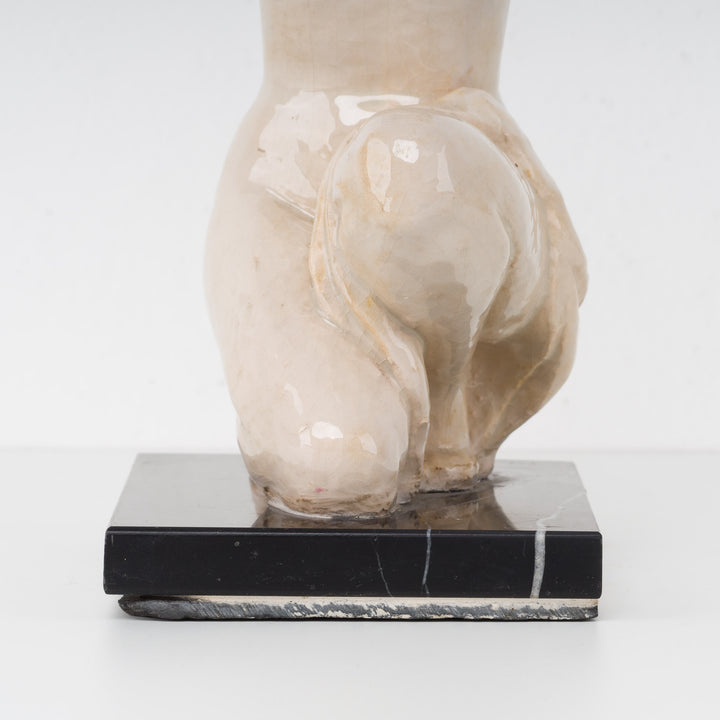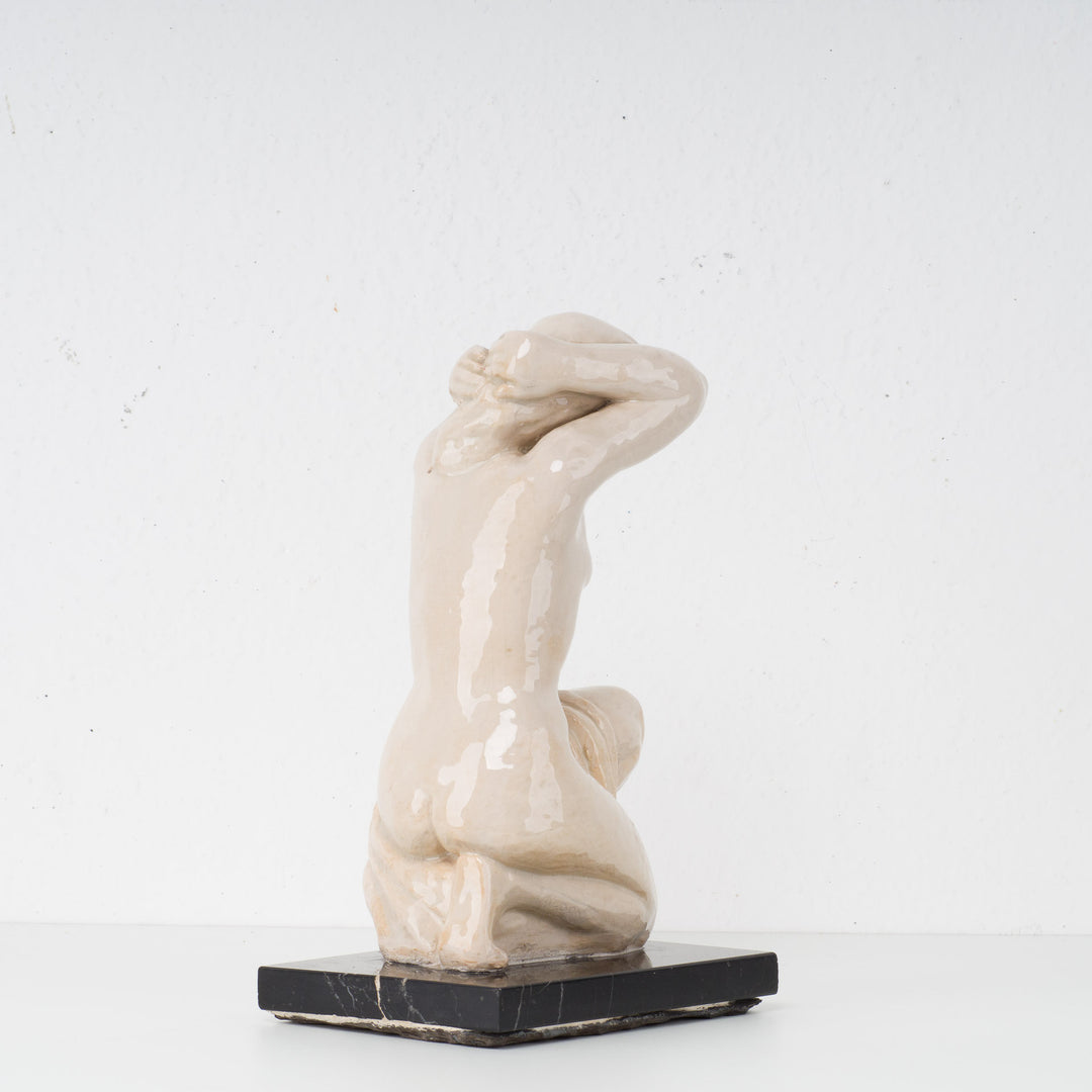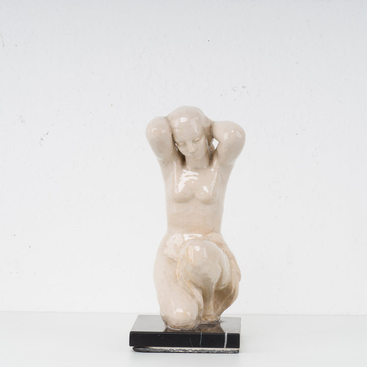 Breng de tijdloze schoonheid van de menselijke vorm in jouw interieur met dit prachtige beeld van een vrouwelijk naakt, gecreëerd door de kunstenaar Faildon. Het beeld, geglazuurd in een zachte beige kleur, straalt elegantie en ingetogen kracht uit. Met zijn afmetingen van 13x17,5x28 cm en een stevige zwarte marmeren sokkel, is dit kunstwerk een verfijnde toevoeging aan elke ruimte.
