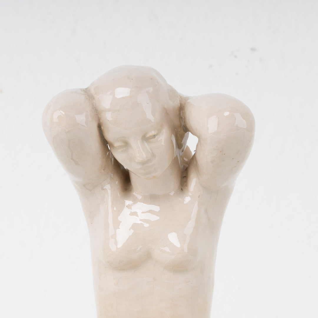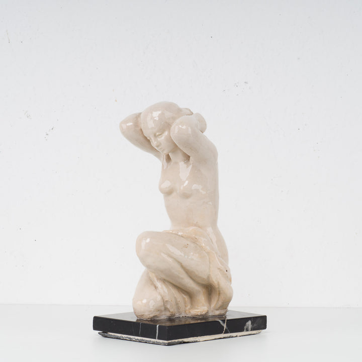 Tijdloze elegantie: De ingetogen houding en de subtiele glazuurlaag geven dit beeld een serene, klassieke uitstraling die perfect past in een smaakvol ingericht interieur.
