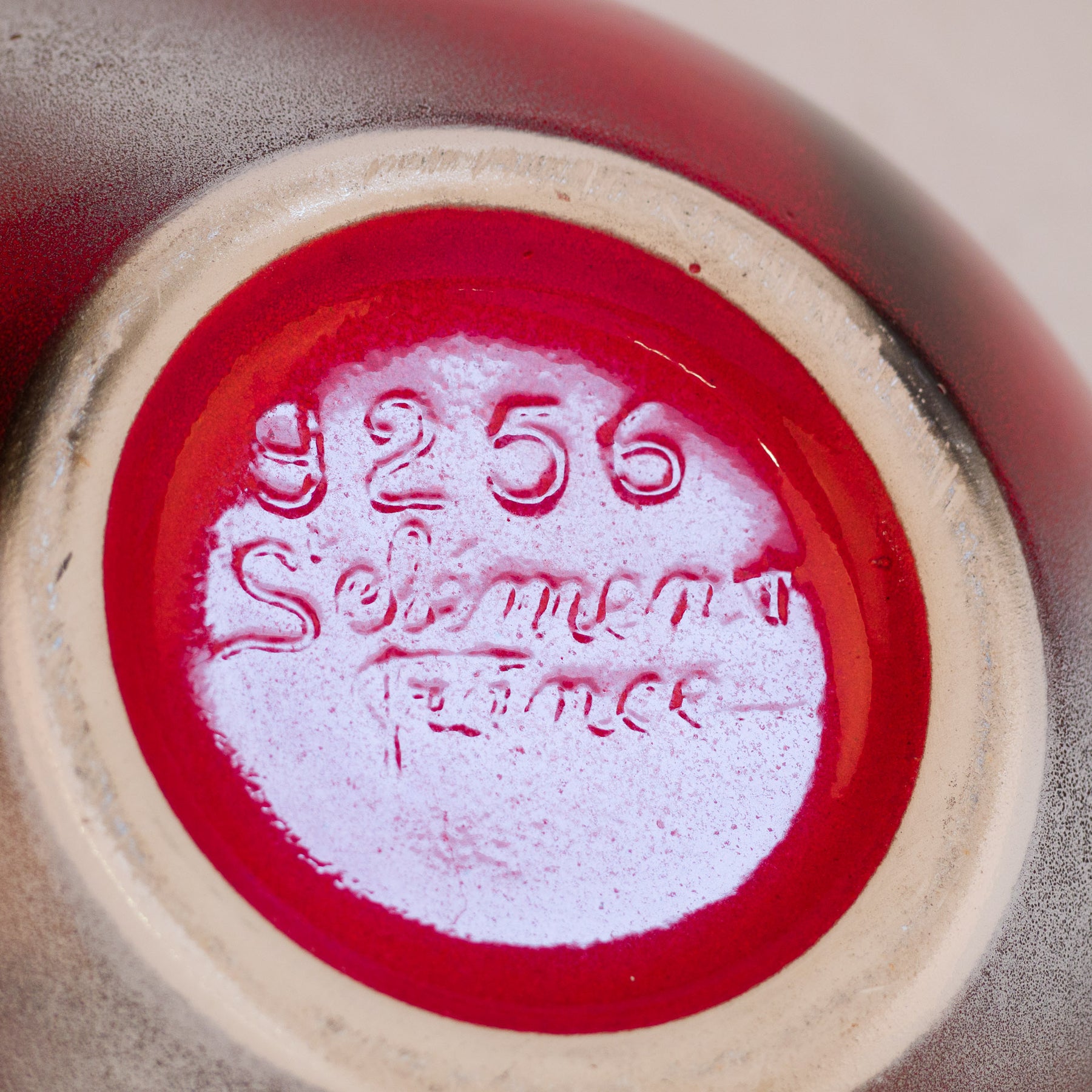 De vaas is onderaan gesigneerd “Sélémen France” en draagt het modelnummer 9256, wat wijst op een genummerde productie binnen het atelier. Dit detail onderstreept het authentieke karakter van het stuk en maakt het extra interessant voor liefhebbers van vintage Frans keramiek.