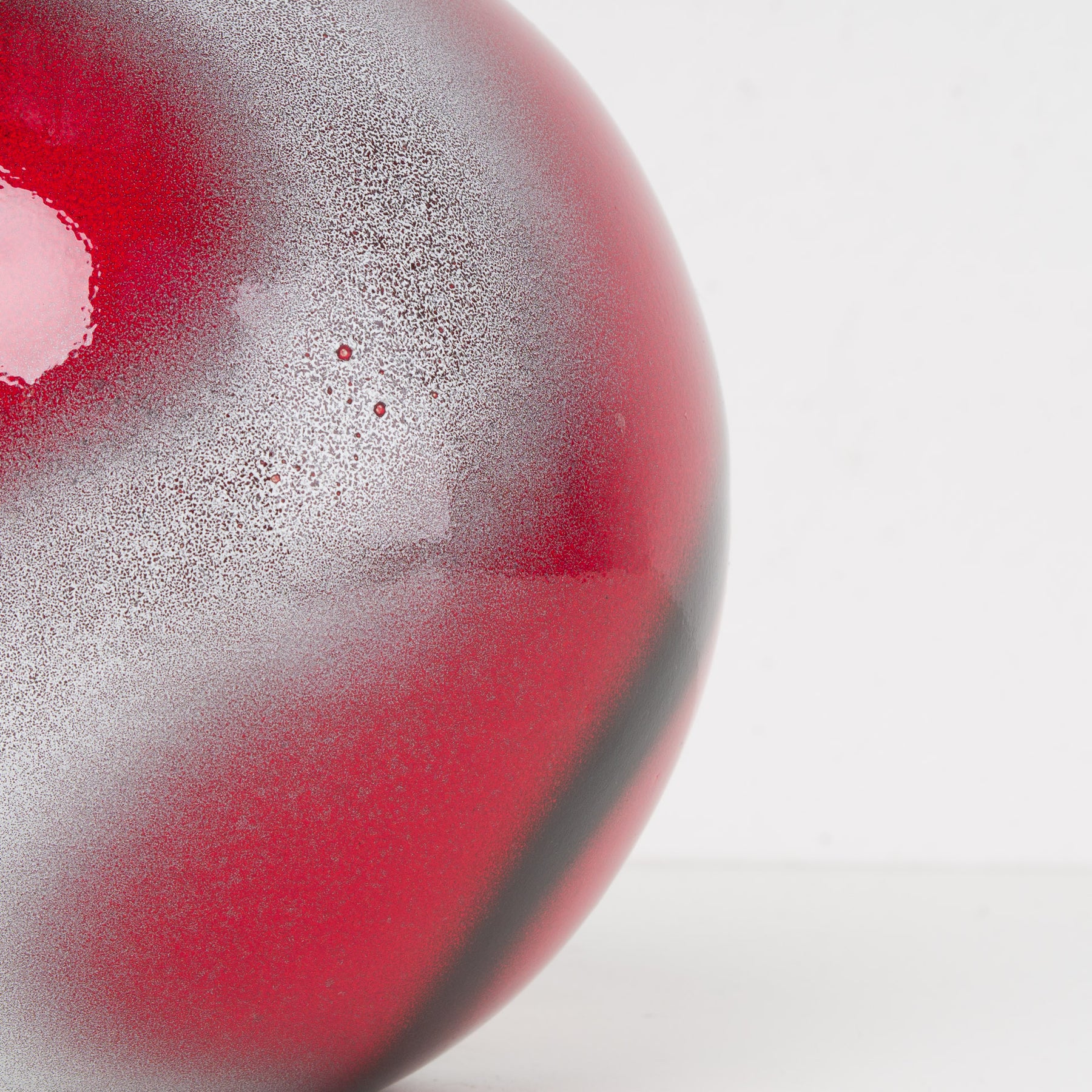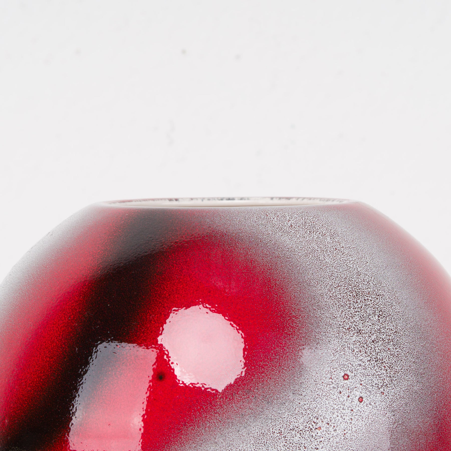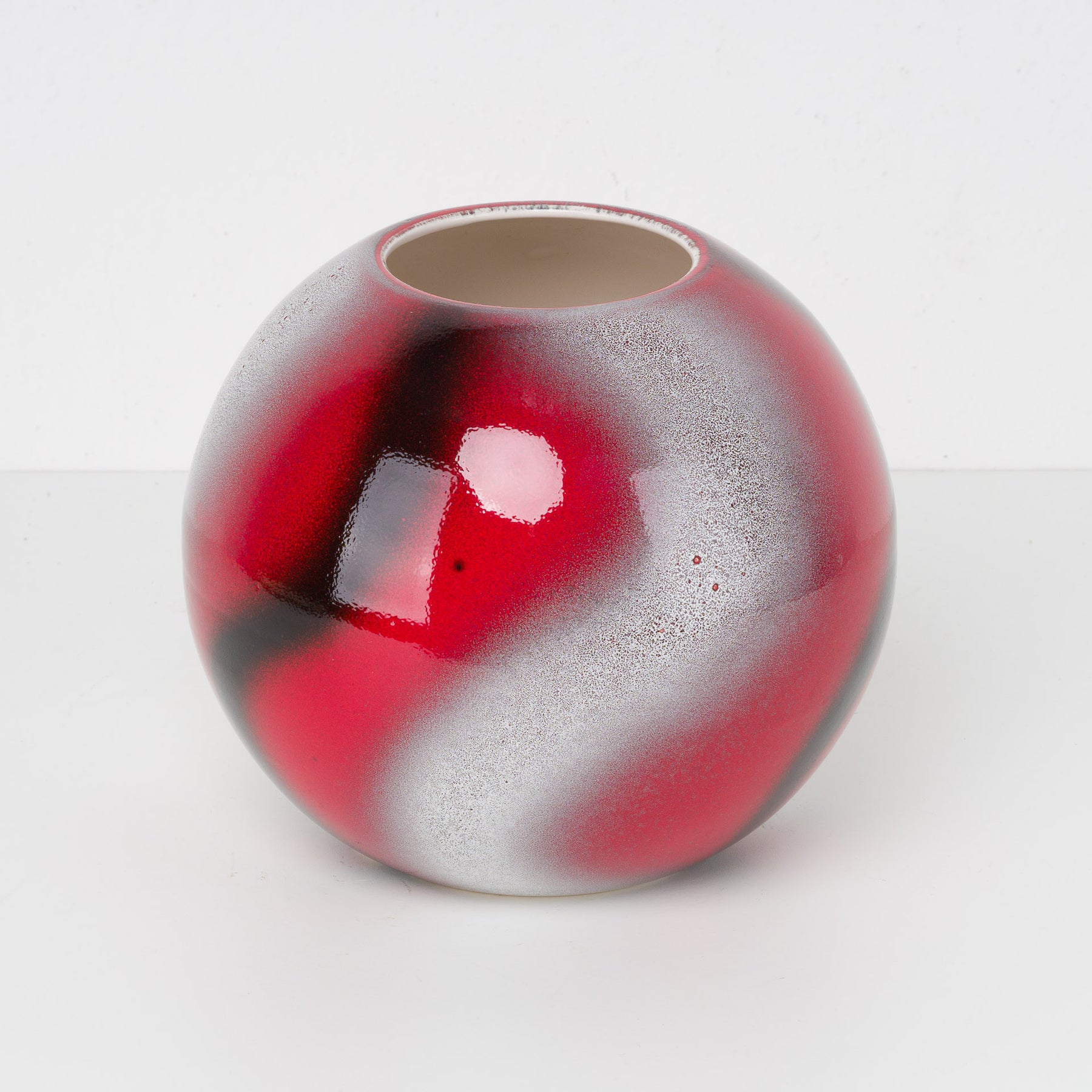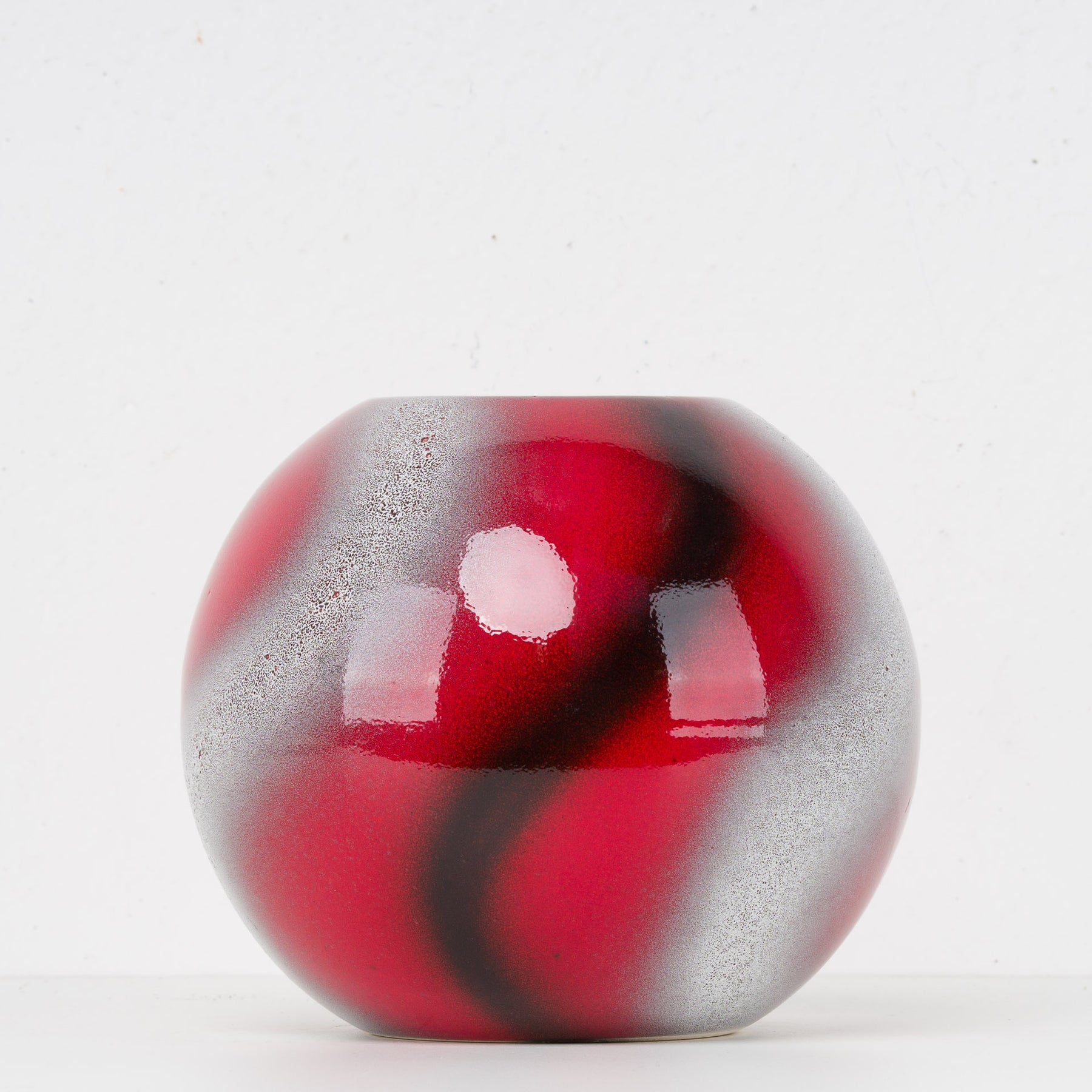 De glanzende, licht gemêleerde afwerking creëert een levendig spel van licht en reflectie. De combinatie van diep rood met zilverachtige nuances en donkere schakeringen geeft de vaas een bijna kosmisch effect — krachtig maar verfijnd. Dankzij de bolvorm komt ze zowel solo tot haar recht als in combinatie met sobere takken of bloemen.